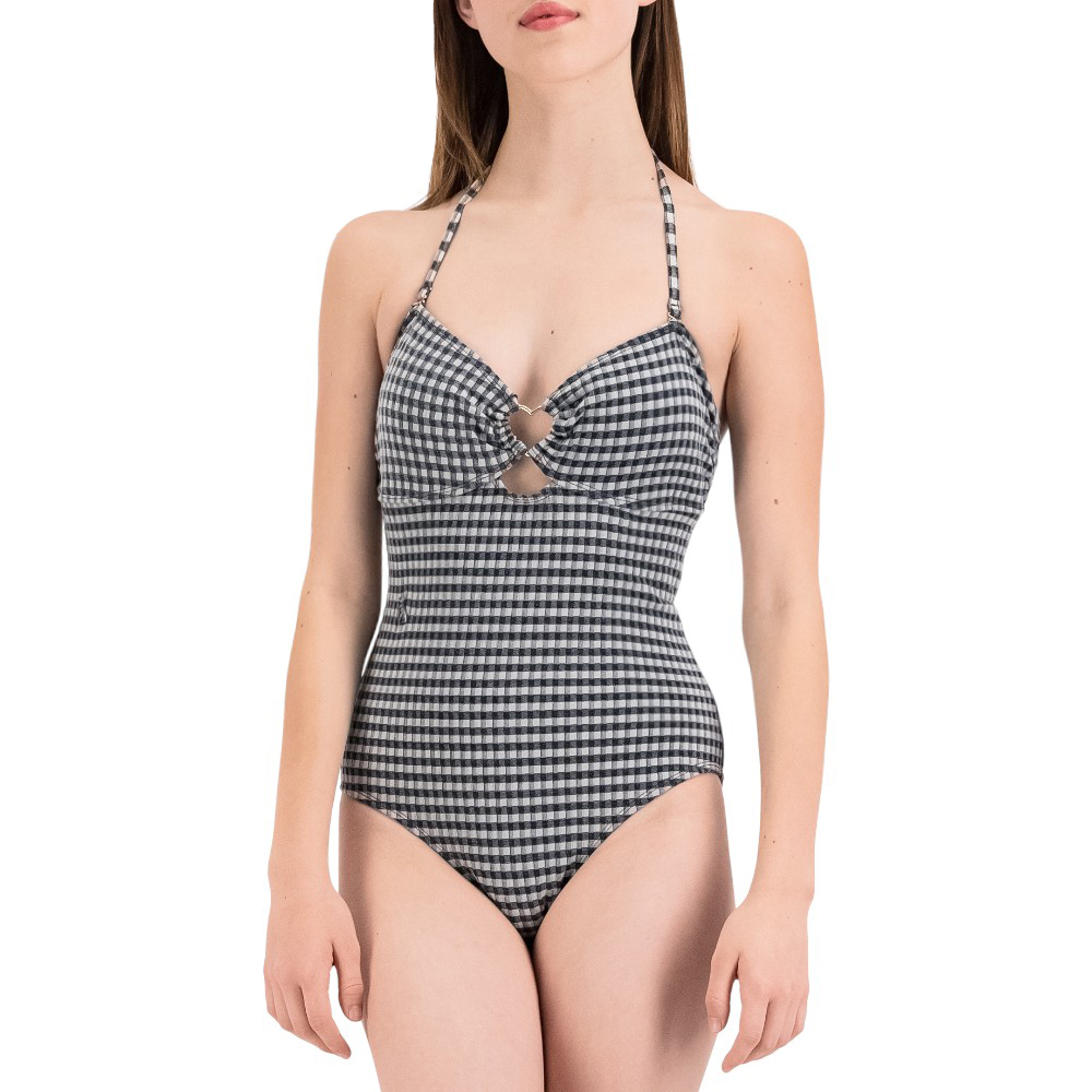 Este bikini de cuadros combina modernidad y comodidad gracias a su cintura en contraste. La parte superior con cruce ajustable estiliza el torso, mientras que la inferior elástica ofrece un ajuste seguro. Perfecto para un look juvenil y vibrante.