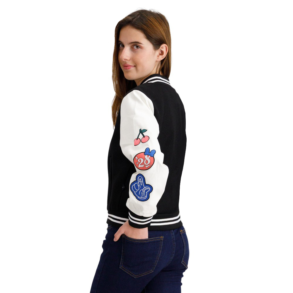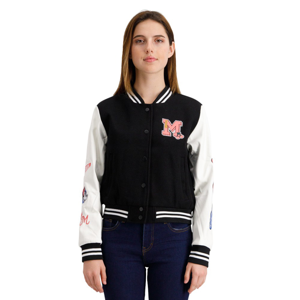 Chamarra tipo bomber para mujer con cierre a presión, bolsas laterales y aplicaciones bordadas de Minnie Mouse. Cómoda, moderna y con ajuste en puños y ruedo para un estilo casual y lleno de magia Disney.