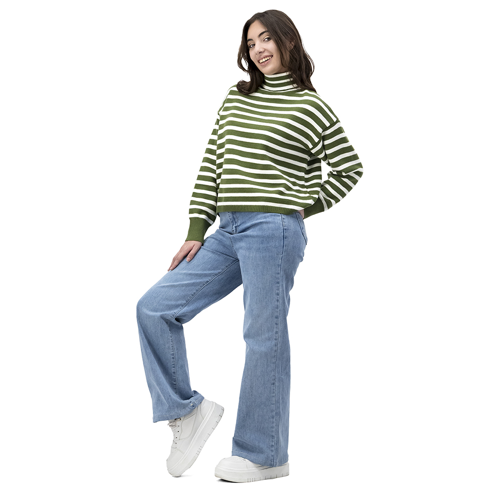 Consigue un estilo cálido y moderno con nuestro suéter cerrado de cuello de tortuga para mujer. Incluye un elegante cuello de tortuga, manga larga con ajuste en puños, atractivo diseño de rayas y diseño cerrado. ¡El suéter mujer de rayas perfecto para un look abrigador y con estilo!
