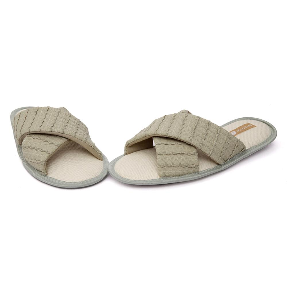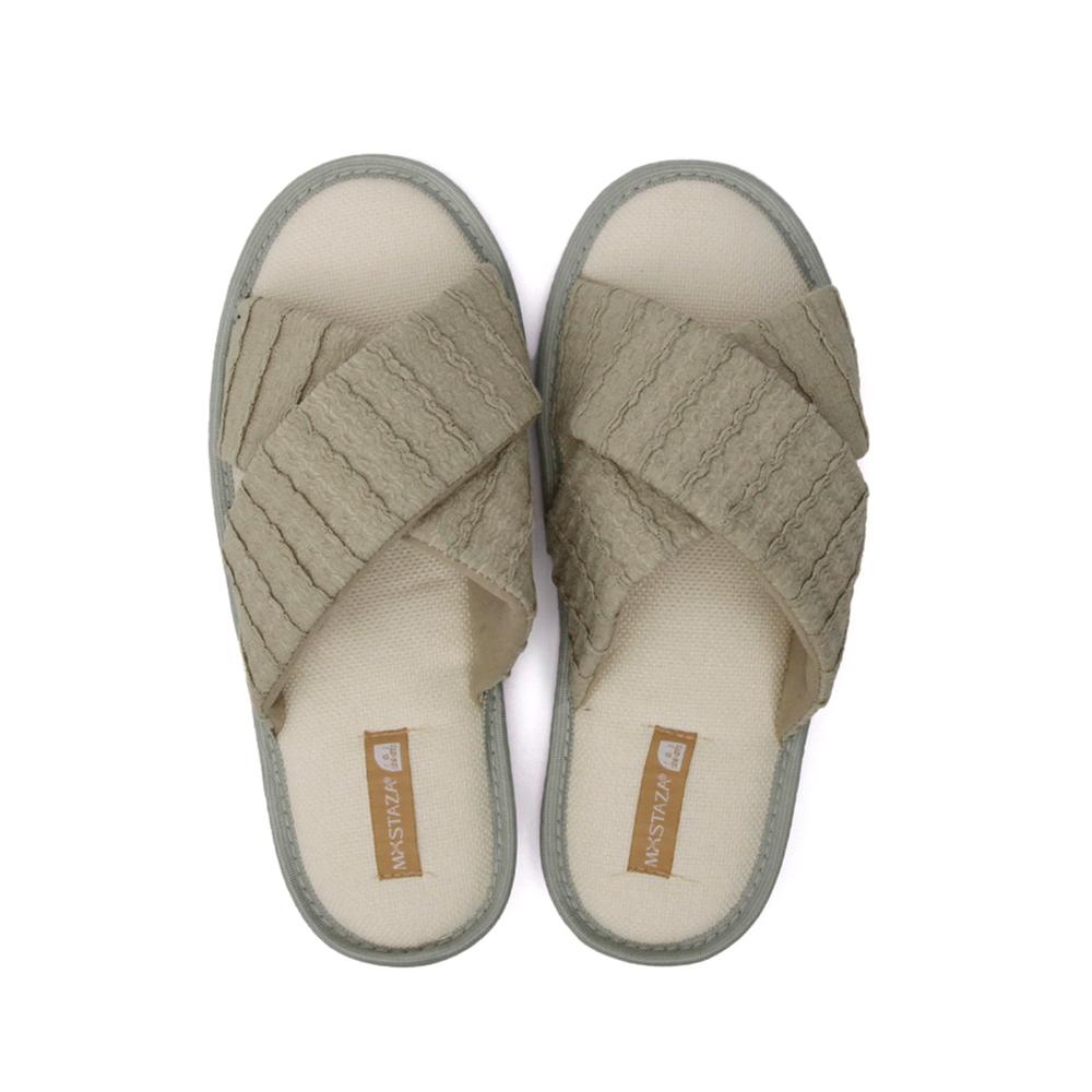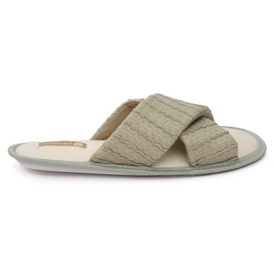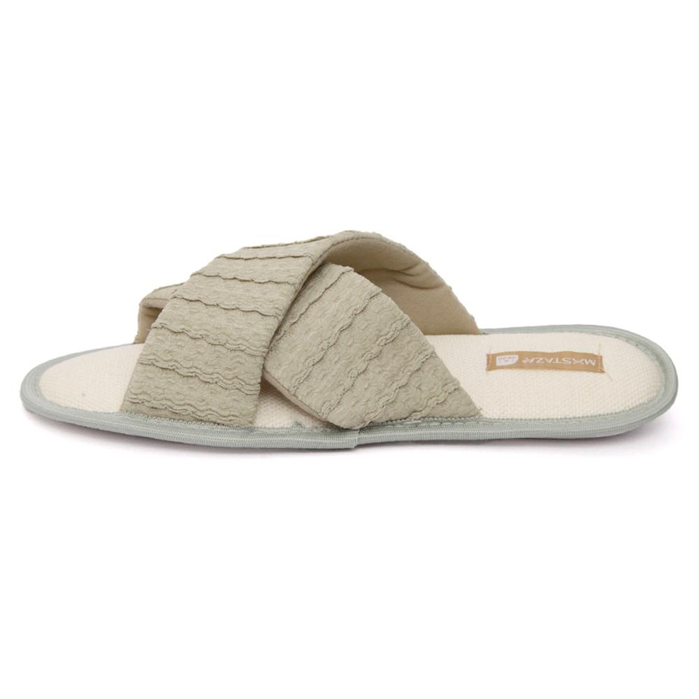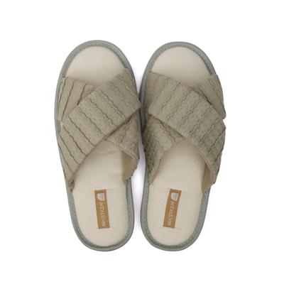 Relájate con esta pantufla cruzada de textura toalla. Su diseño suave y suela delgada ofrecen frescura y comodidad, ideal para el hogar y momentos de descanso.