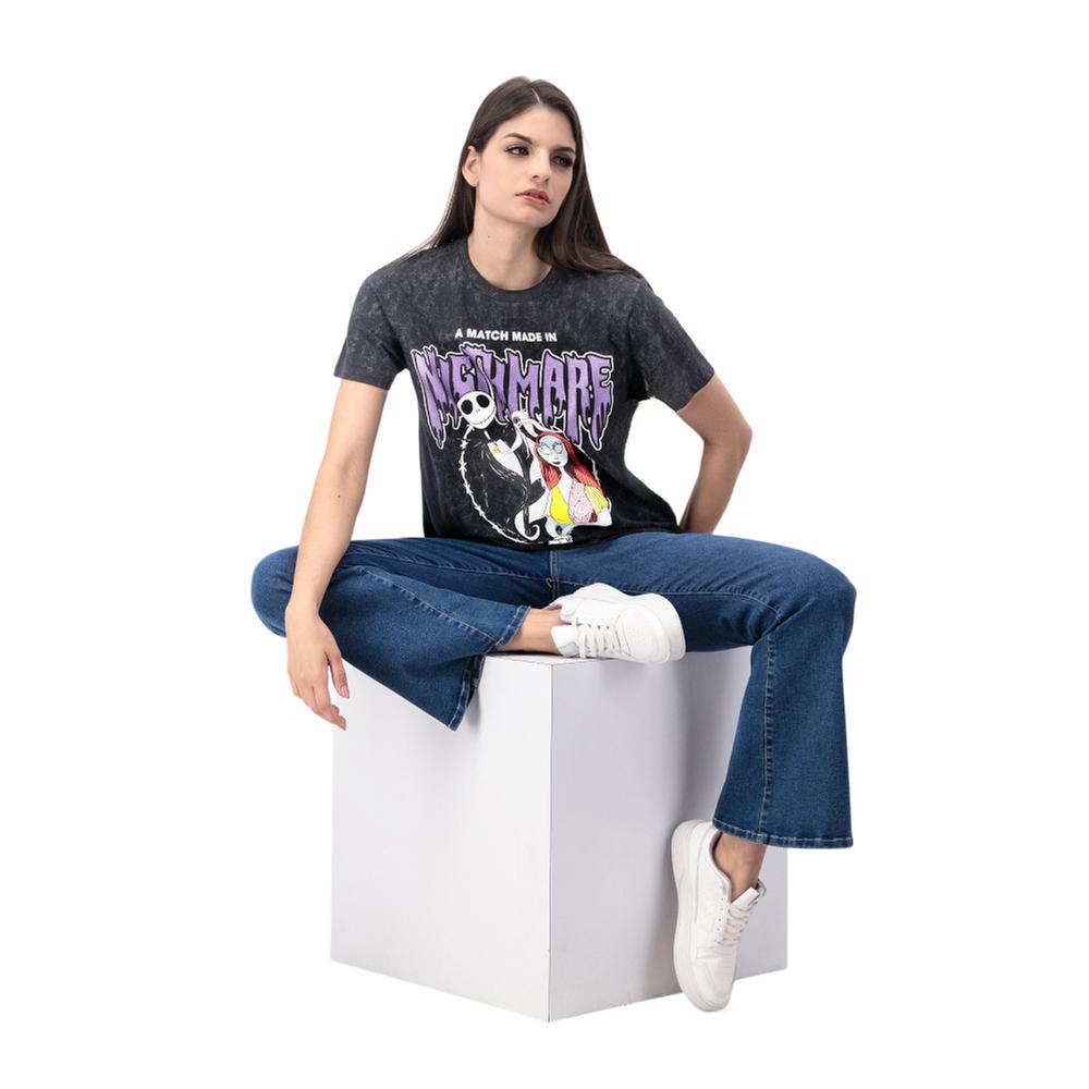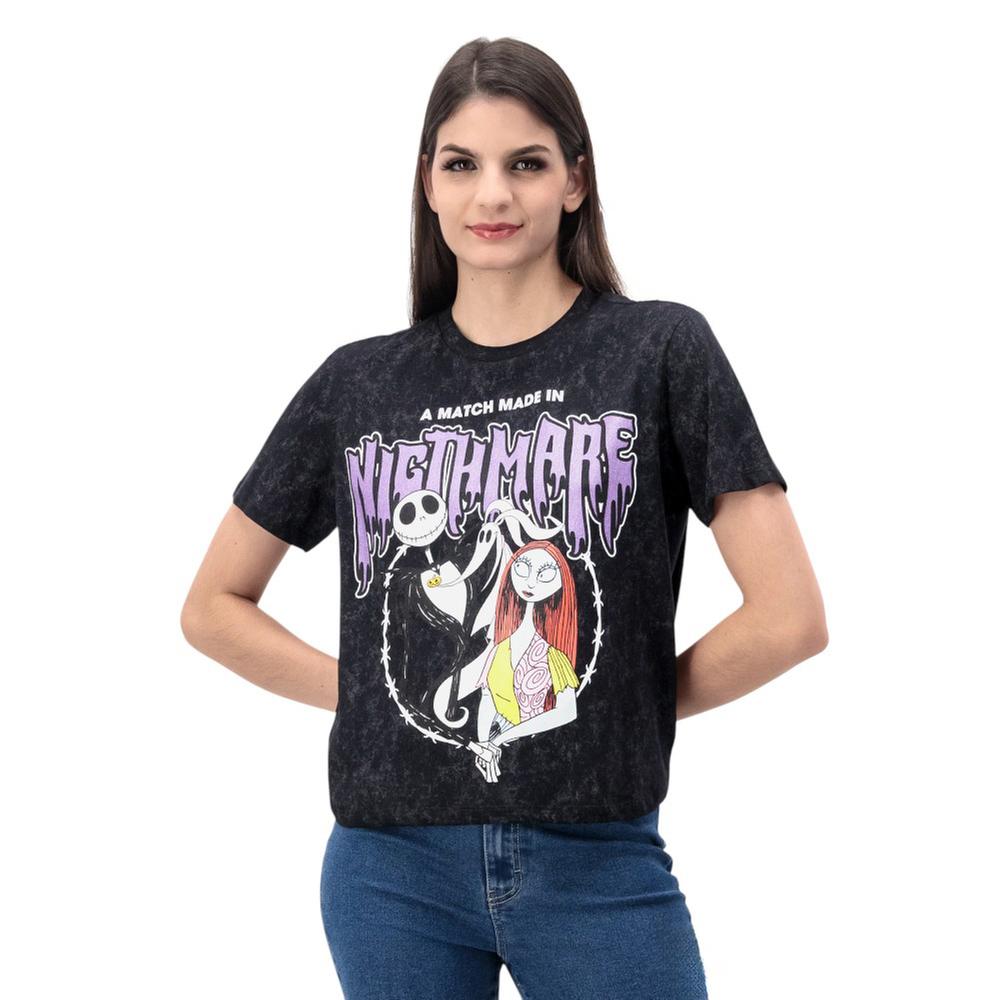 Los icónicos personajes en una playera. Diseño de rayas con estampado frontal de Jack, Sally y Zero. Cuello redondo y manga corta para un look de ensueño.