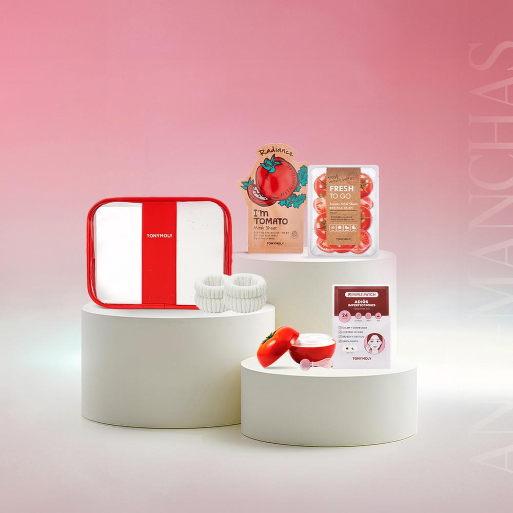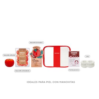 1 Mascarilla I'm Real Tomate, 1 Mascarilla Fresh to go Tomate, 1 Pimple Patch, 1 Mascarilla Détox en Crema, 2 Bandas.