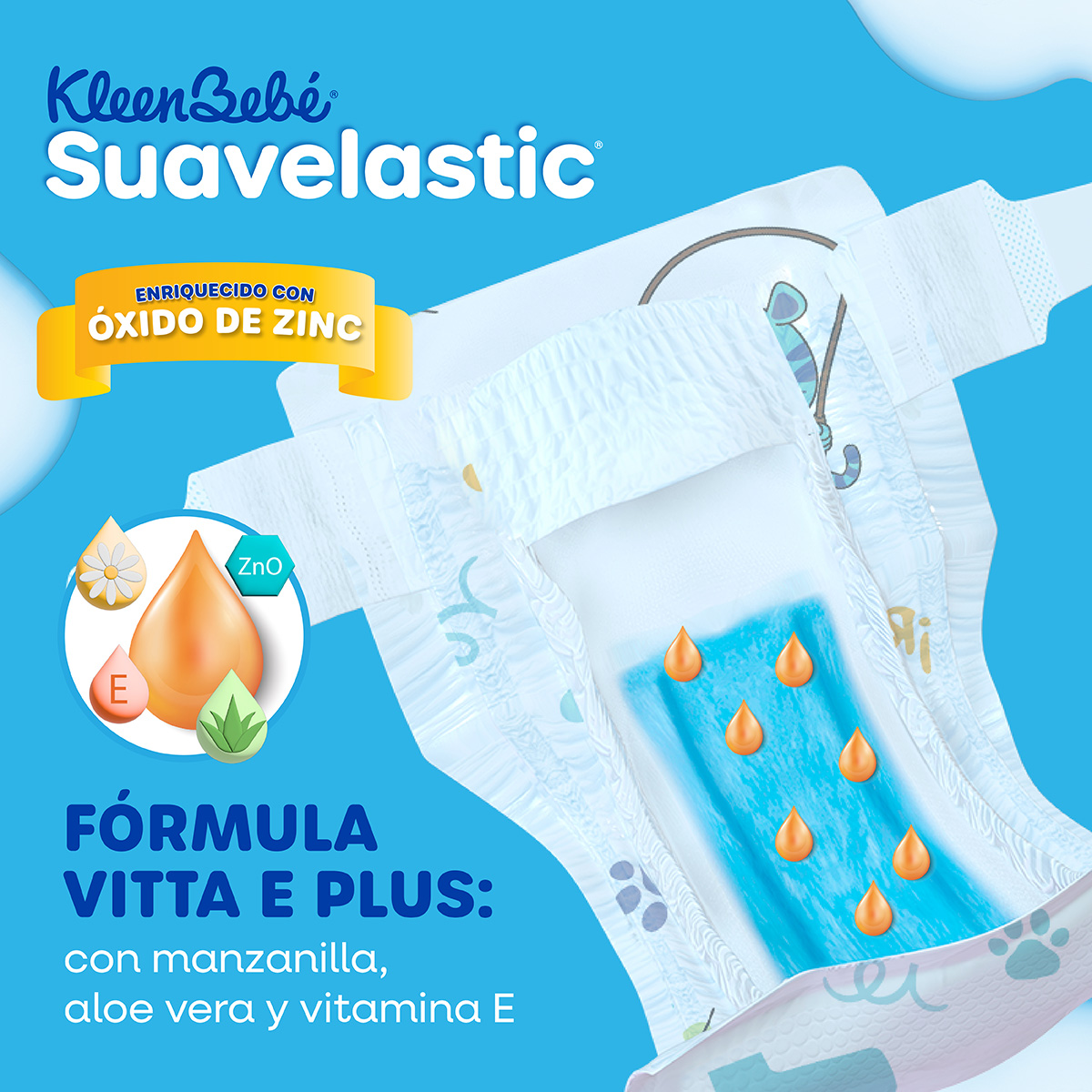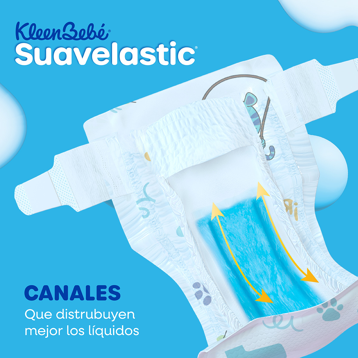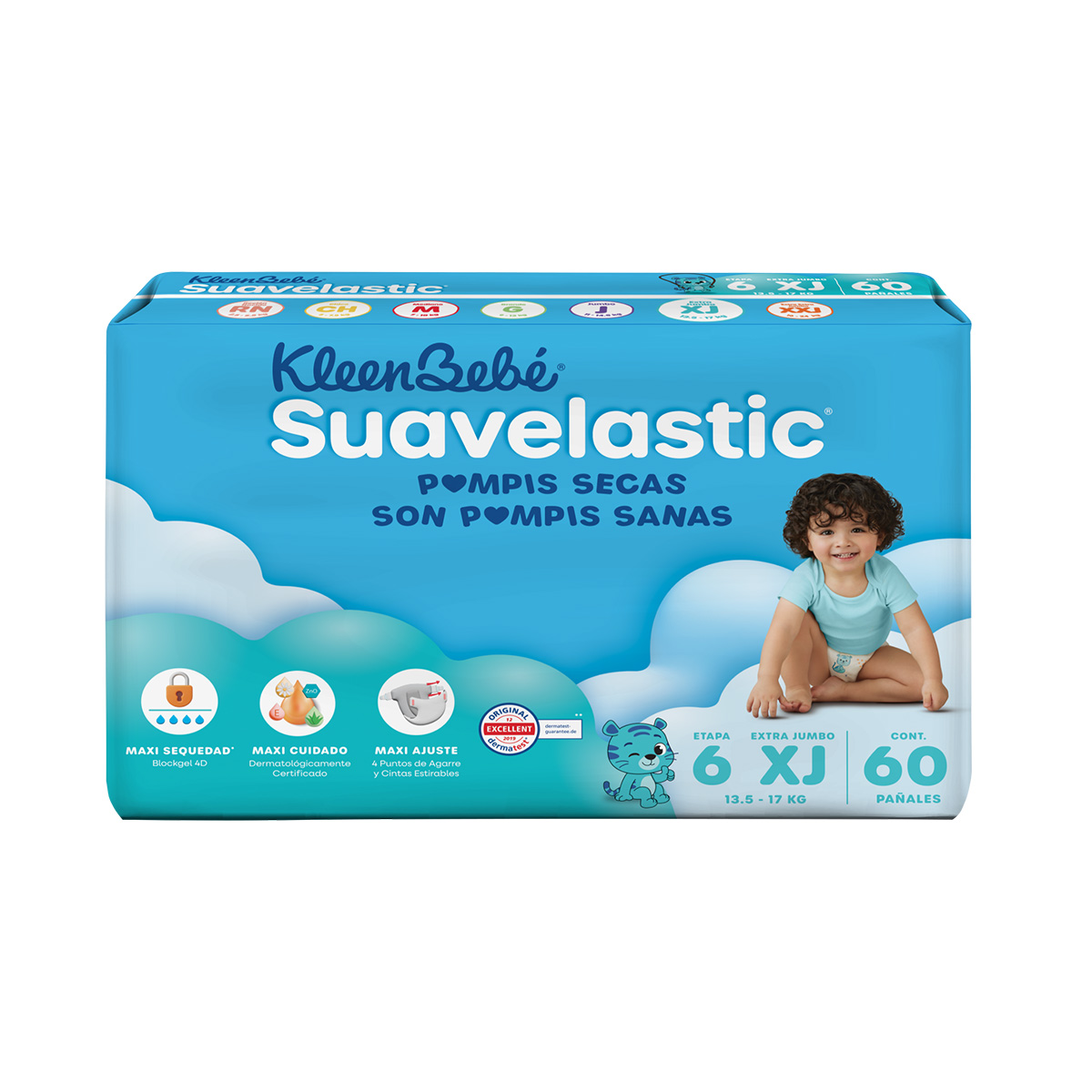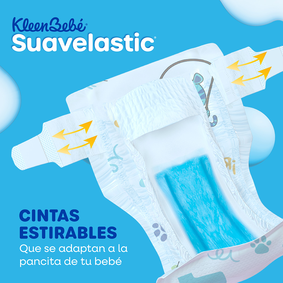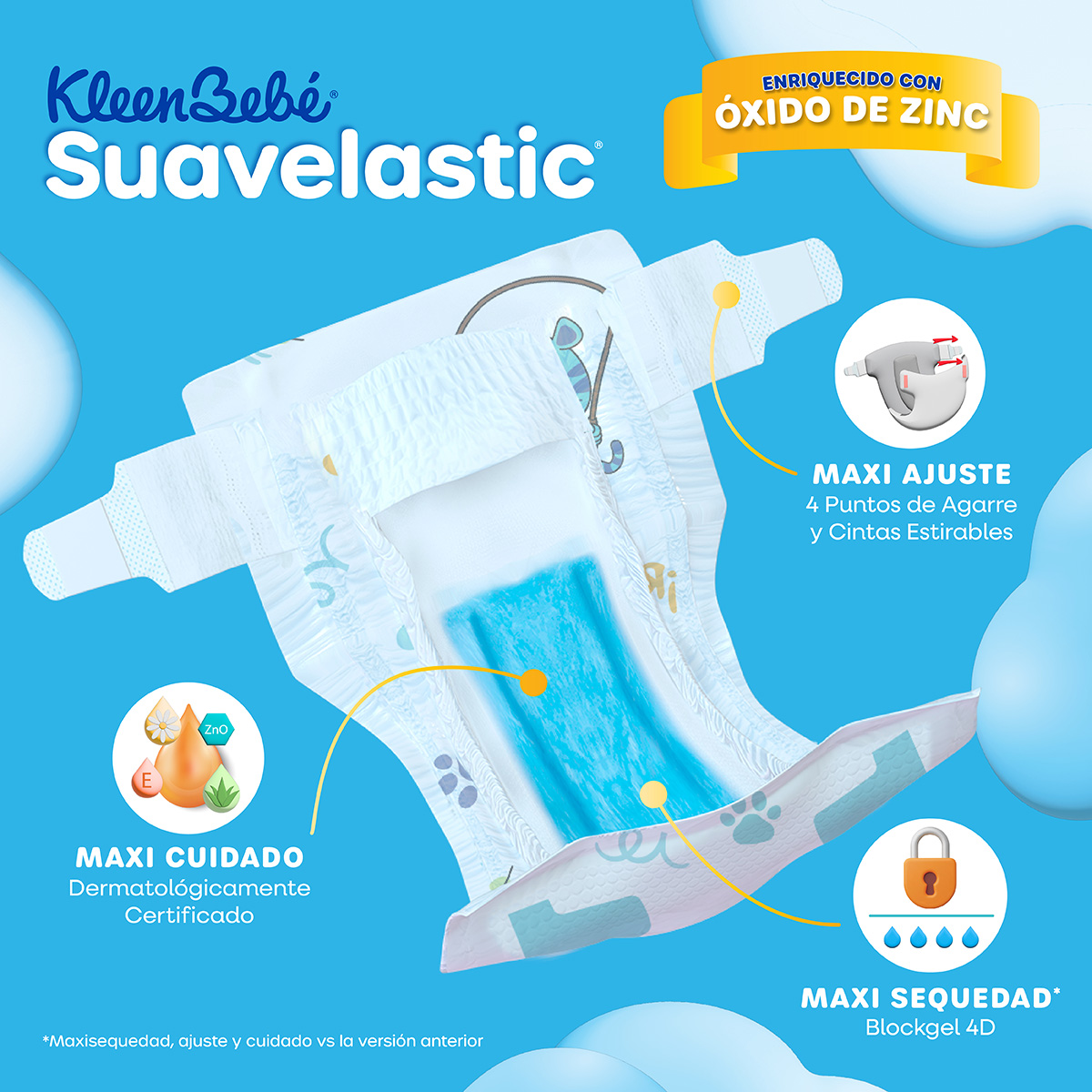 Cuidado y protección para tu bebé con para tu bebé los pañales KleenBebé Suavelastic, diseñados para brindar una protección integral durante las primeras etapas de exploración. Gracias a su avanzada tecnología blockgel 4D, garantizan una maxi sequedad que mantiene la humedad lejos de su piel por más tiempo. Su suavidad superior, potenciada con la fórmula enriquecida con vitamina E, aloe, manzanilla y óxido de zinc, asegura un maxi cuidado contra irritaciones. Además, su sistema de cintas estirables ofrece un maxi ajuste que se adapta a cada movimiento, brindando libertad y comodidad absoluta en todo momento.