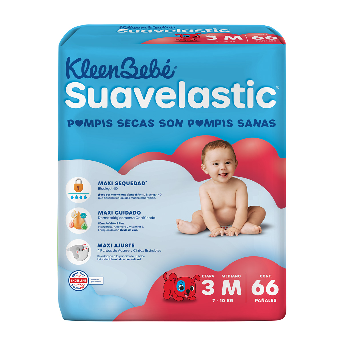 Cuidado y protección para tu bebé con para tu bebé los pañales KleenBebé Suavelastic, diseñados para brindar una protección integral durante las primeras etapas de exploración. Gracias a su avanzada tecnología blockgel 4D, garantizan una maxi sequedad que mantiene la humedad lejos de su piel por más tiempo. Su suavidad superior, potenciada con la fórmula enriquecida con vitamina E, aloe, manzanilla y óxido de zinc, asegura un maxi cuidado contra irritaciones. Además, su sistema de cintas estirables ofrece un maxi ajuste que se adapta a cada movimiento, brindando libertad y comodidad absoluta en todo momento.
