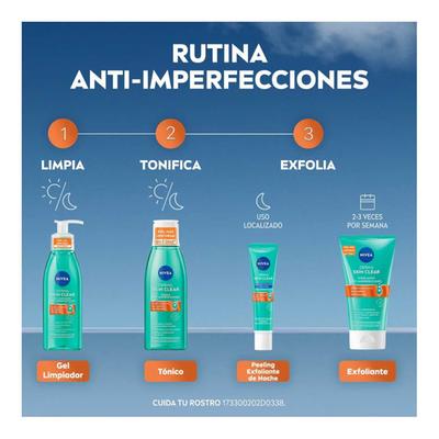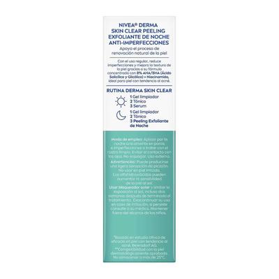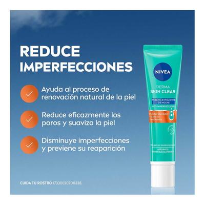 Consigue la textura en tu rostro que siempre has deseado con el peeling exfoliante de noche anti-imperfecciones Nivea Derma Skin Clear, está especialmente formulado para pieles con tendencia a imperfecciones. Enriquecido con un 8% de ácido salicílico y glicólico favorece el proceso de renovación natural de la piel, afina poros y reduce las imperfecciones a la vez que previene la aparición de otras nuevas. Para una piel visiblemente más clara en 7 días.