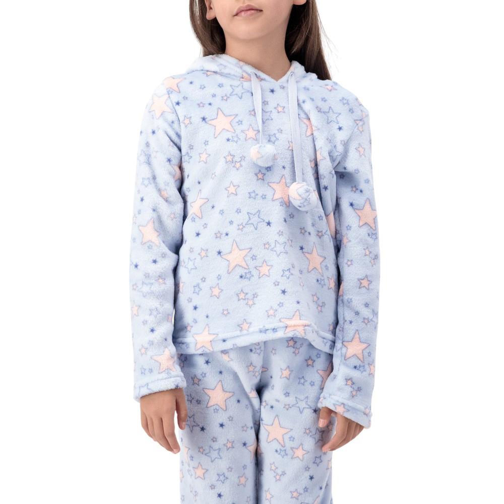Pijama completo con diseño full print de estrellas que combina comodidad y estilo para que las niñas disfruten de noches cálidas y dulces sueños. La sudadera incluye capucha con orejas y jareta, mientras que el pantalón tiene cintura elástica para un ajuste perfecto. Ideal para dormir o momentos de descanso en casa.