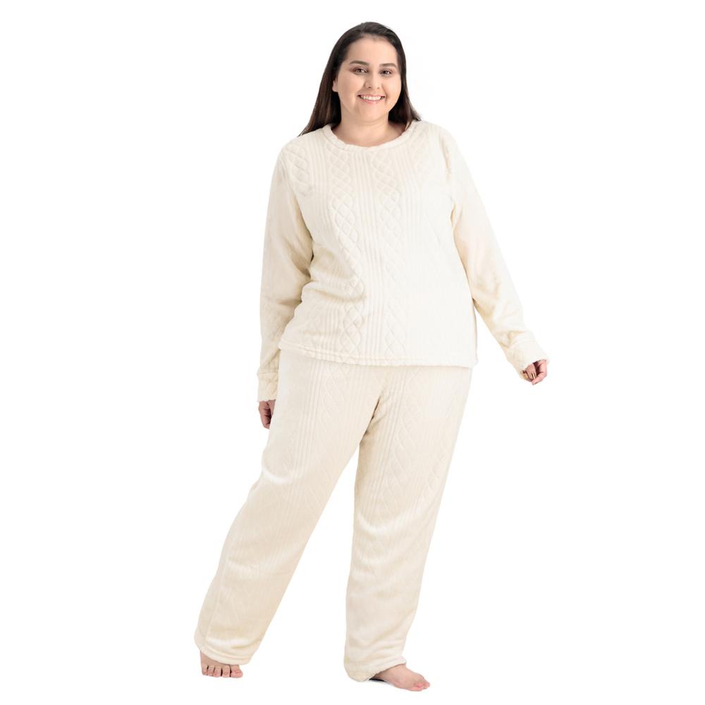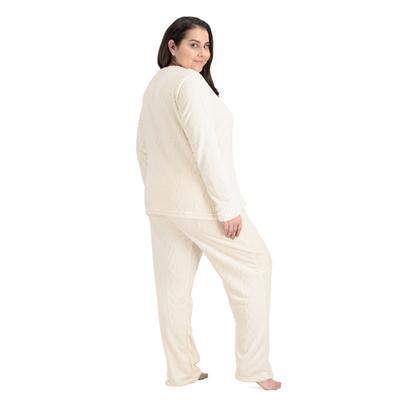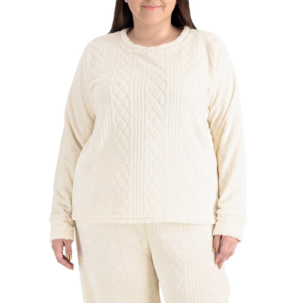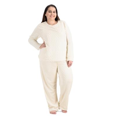 Este pijama para mujer combina comodidad y estilo con su sudadera de manga larga y cuello redondo que ofrece abrigo y libertad de movimiento, mientras que el pantalón con elástico en la cintura asegura un ajuste cómodo y seguro. El diseño tipo tejido aporta un toque elegante y moderno, haciendo de este conjunto la opción perfecta para descansar con estilo.