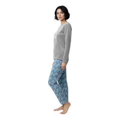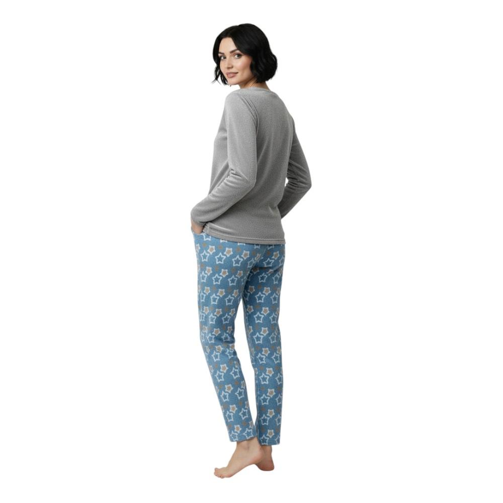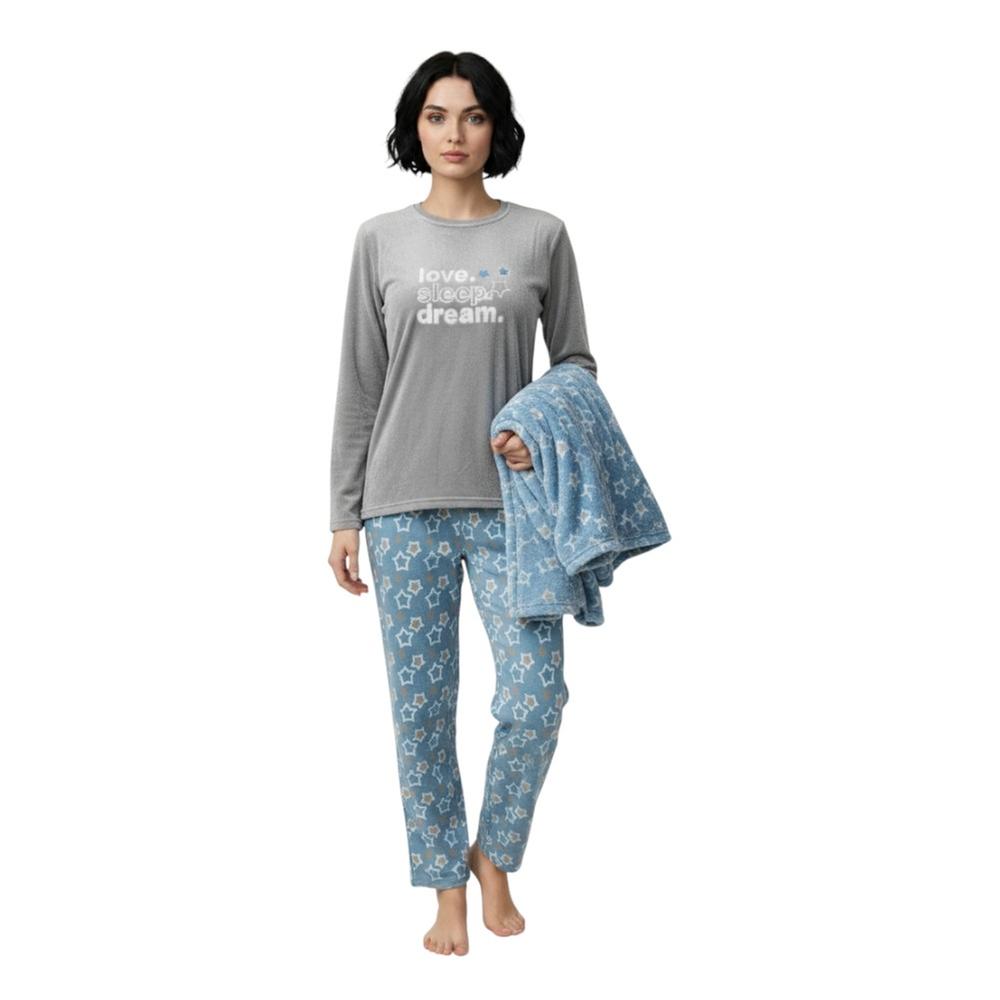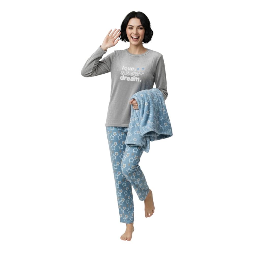 Disfruta de noches llenas de confort con este pijama para mujer que incluye playera de manga larga con cuello redondo y delicado bordado frontal, pantalón con diseño full print de estrellas que añade un toque divertido y acogedor, acompañado de una cobija suave para mayor calidez y comodidad.