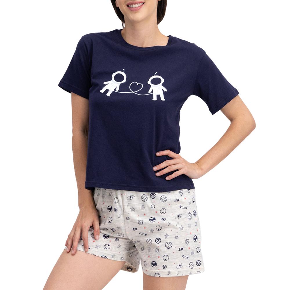 Disfruta de noches cómodas y llenas de estilo con este pijama para mujer que combina una playera lisa de manga corta con estampado frontal y un short con diseño full print que aporta un toque divertido y moderno.