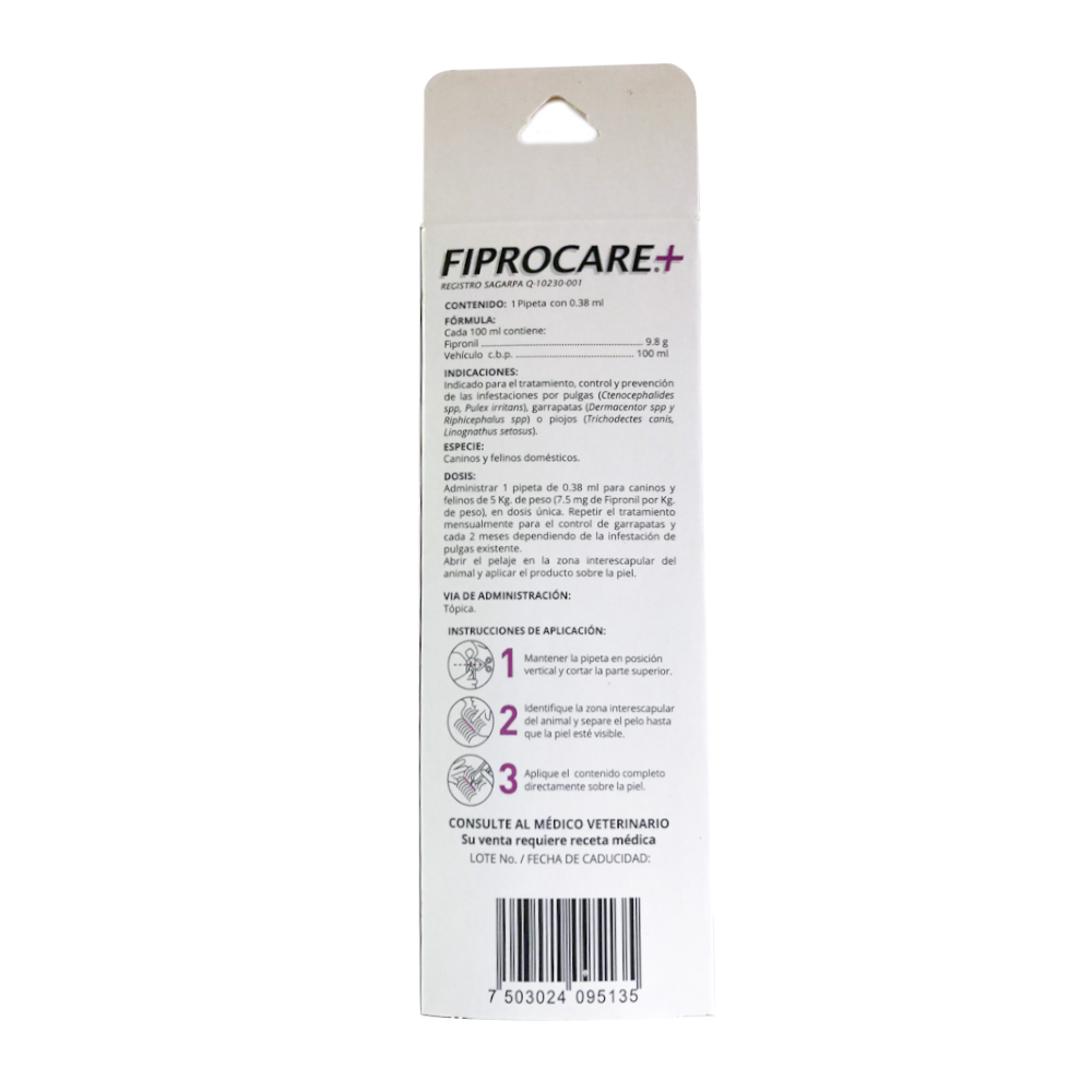 Pipeta Antipulgas y Garrapatas Fiprocare para Gato 0.38 ml