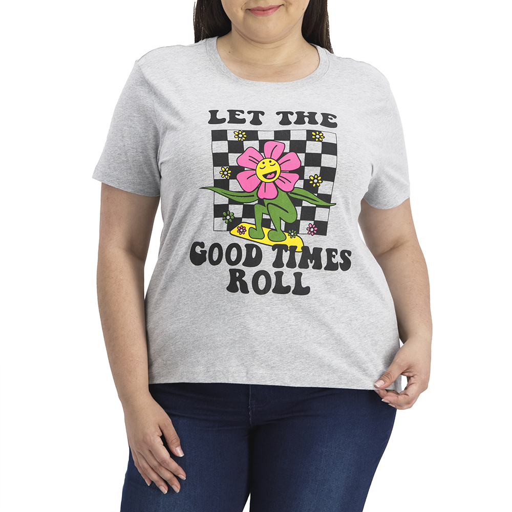 Playera de manga corta y cuello redondo para mujer con estampado frontal Let The Good Times Roll: Esta playera combina comodidad y estilo, confeccionada en algodón suave y transpirable. El llamativo estampado frontal agrega un toque moderno y fresco, ideal para cualquier ocasión casual. Disponible en varias tallas y colores, es una prenda versátil que no puede faltar en tu armario.