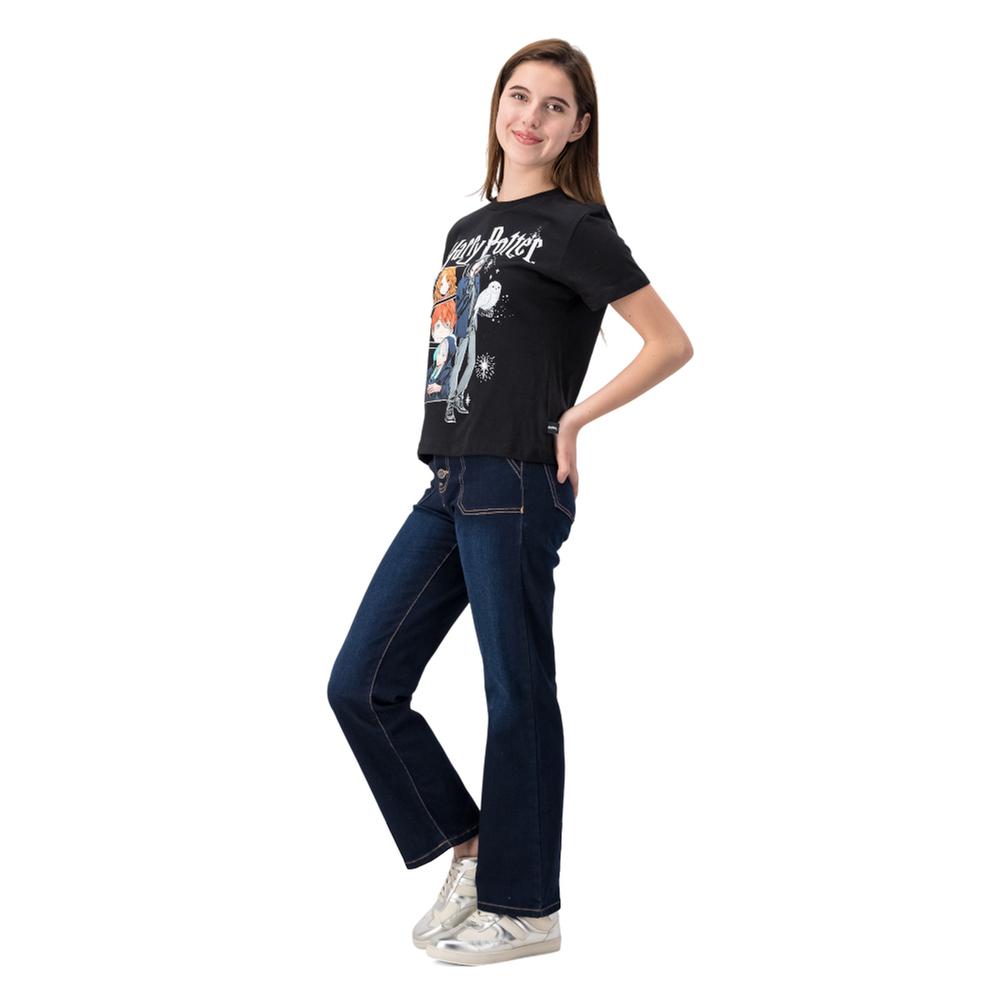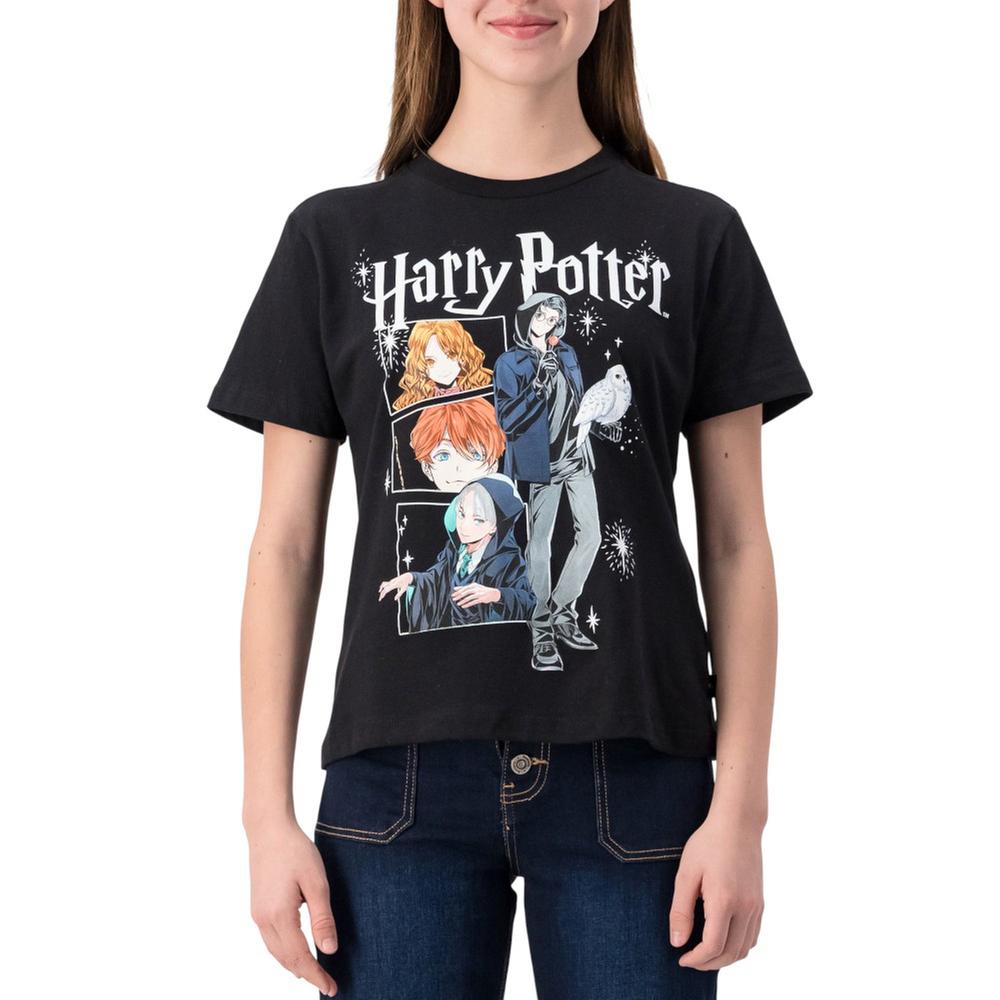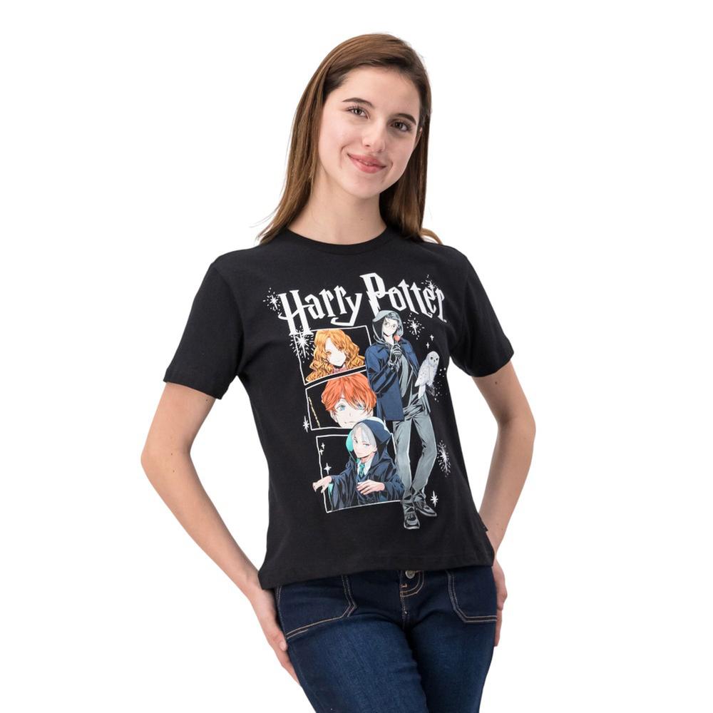 Playera manga corta con estampado frontal de personajes de Harry Potter, confeccionada en algodón suave y ligero Perfecta para looks casuales, aporta comodidad y estilo para el día a día de fanáticas de la saga