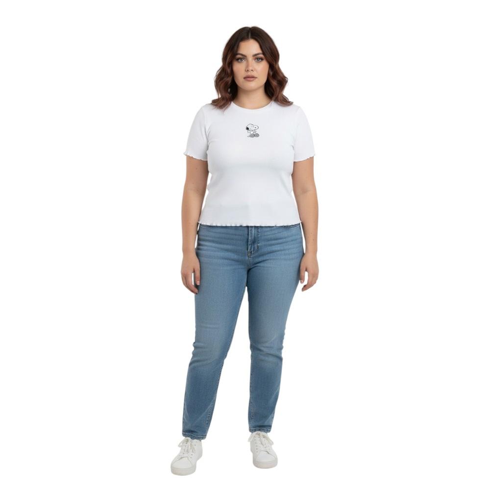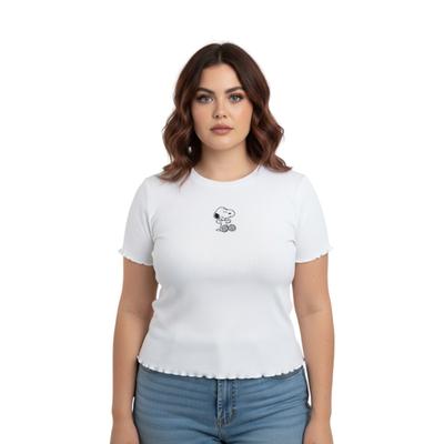 Playera femenina de manga corta con diseño de Snoopy y cuello redondo. Su estilo casual y cómodo la hace ideal para uso diario, ofreciendo un toque divertido y relajado.