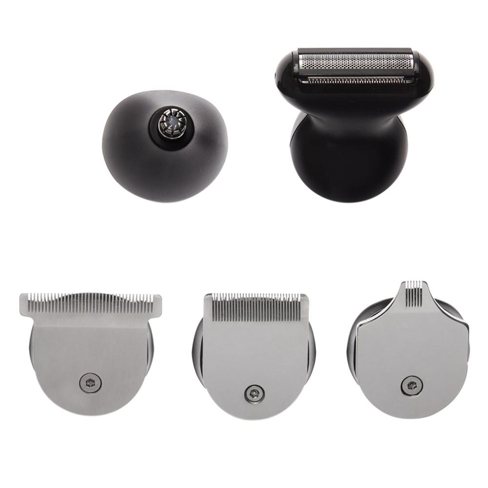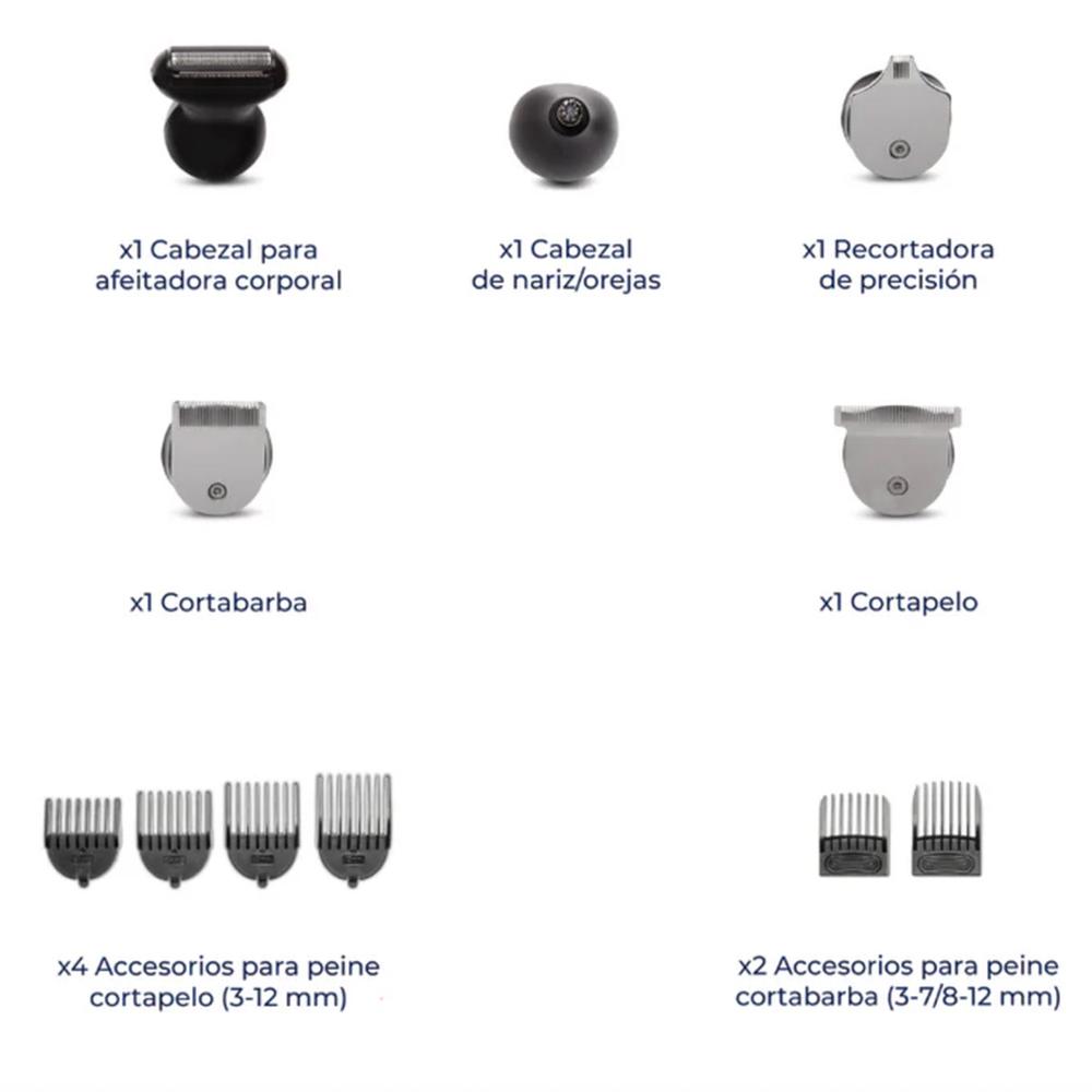 Incluye 5 accesorios: recortadora de barba, cortadora de cabello, recortadora de precisión (con revestimiento de titanio), afeitadora para nariz y orejas, y recortadora corporal.