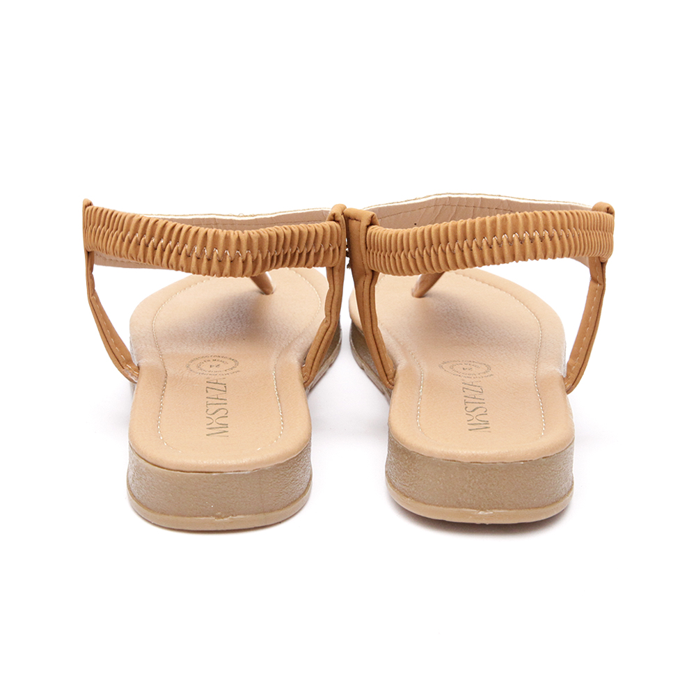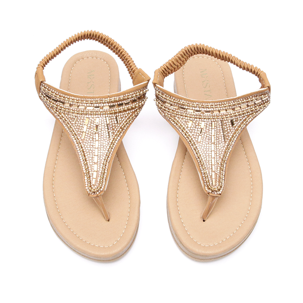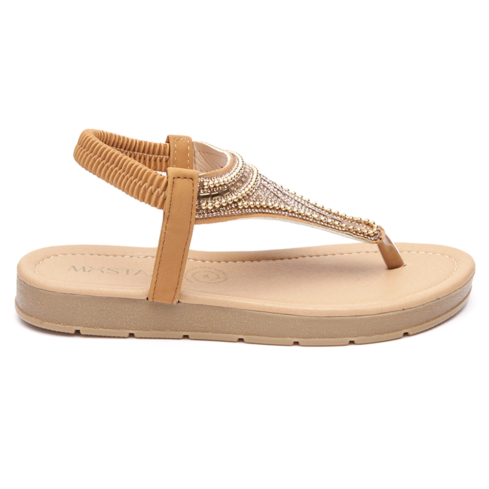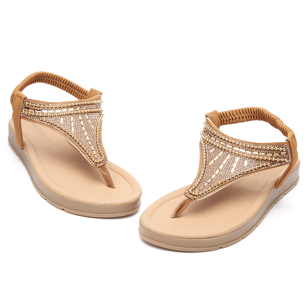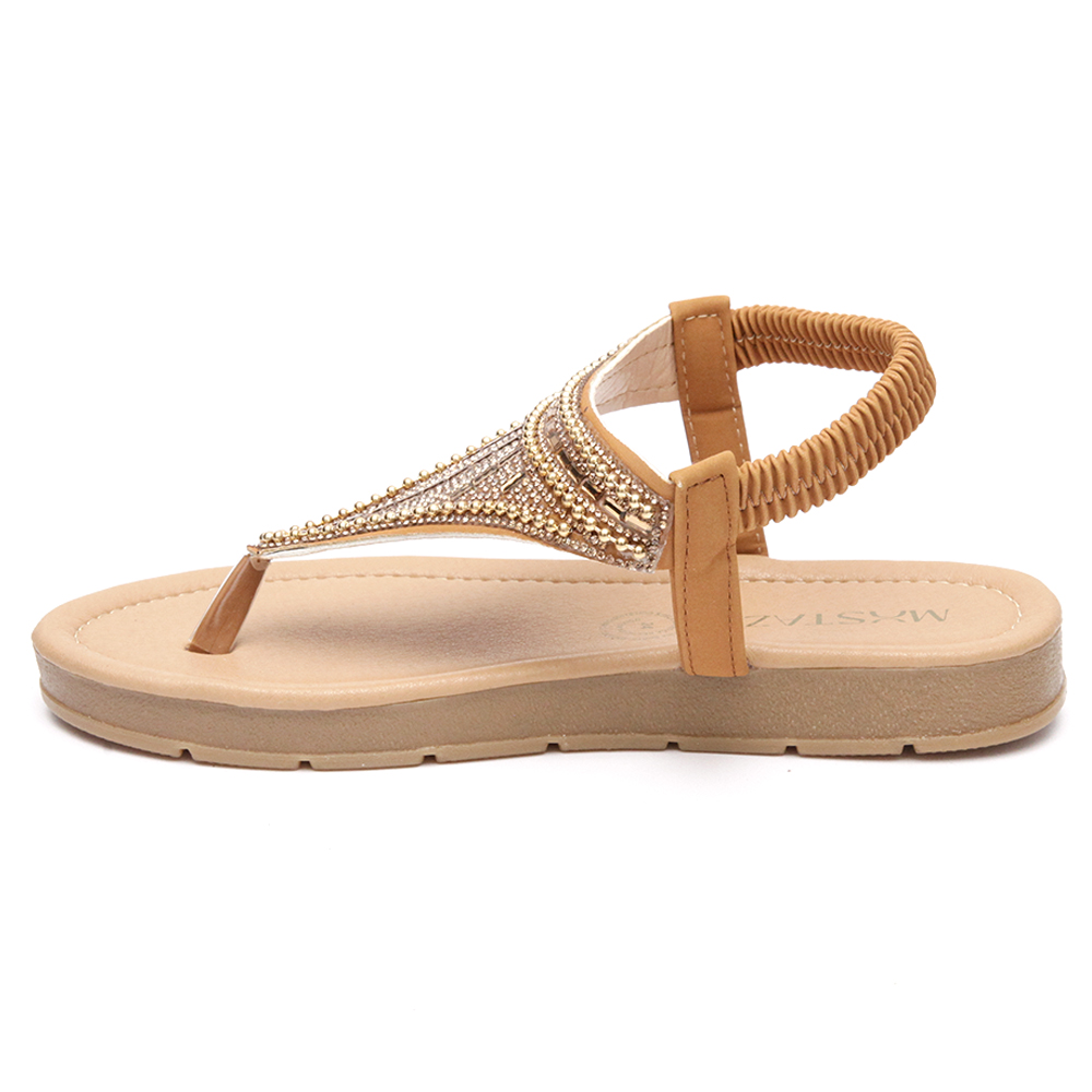 Luce un estilo fresco y cómodo con estas sandalias pata de gallo, perfectas para tus días más relajados. Su diseño plano te brinda confort en cada paso, mientras las aplicaciones decorativas y la cinta trasera añaden un toque chic y seguro. Ideales para combinar con tus looks veraniegos favoritos.