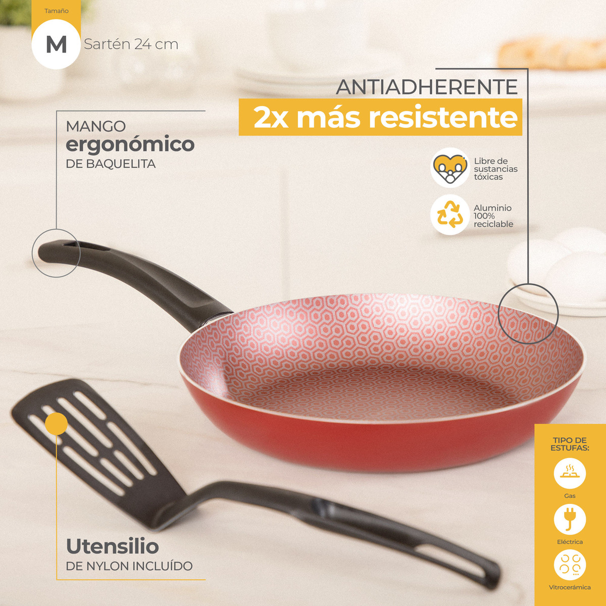 Sartén de 24cm classic rojo, 1 pieza hecho 100% de aluminio el mejor conductor de calor; ideal para tu cocina. Cuenta con Duraflon tecnología antiadherente de alto rendimiento para uso constante, además tiene un espesor de 2.1 mm y mango de baquelita remachado aislante al calor. Cocina grandes momentos con este sartén.
