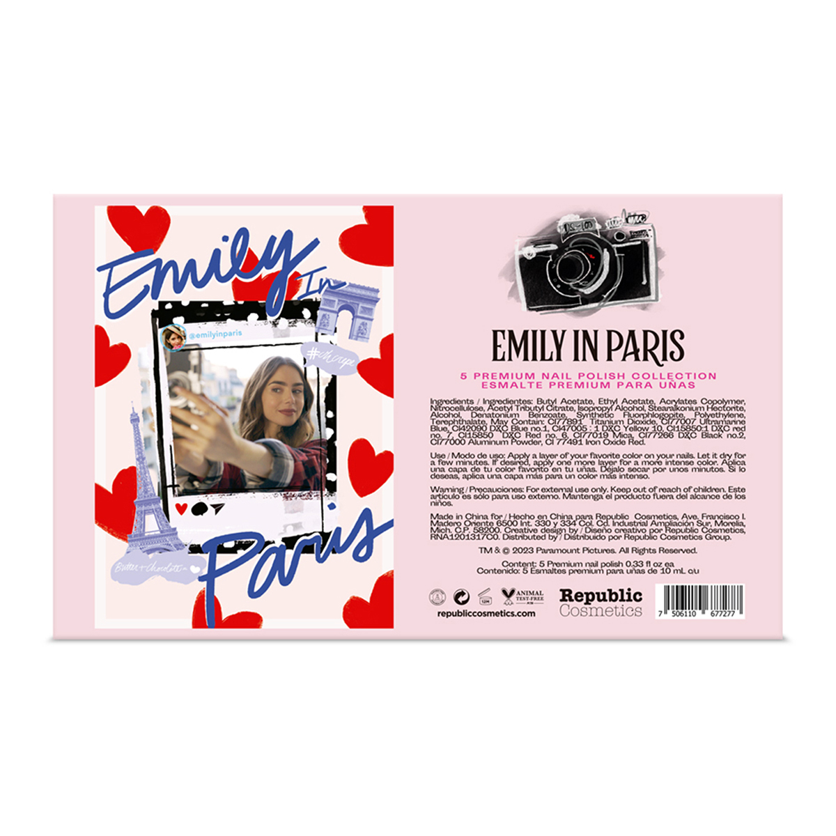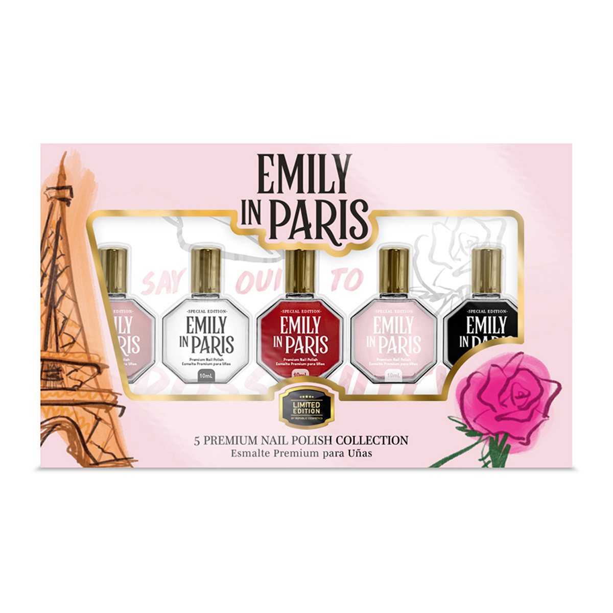 Luce unas uñas fantásticas con el Set de Esmaltes Premium inspirados en la serie Emily In Paris. Republic Cosmetics trae para ti la más alta calidad con cinco magníficos tonos intensos y duraderos, de fácil aplicación. Además, contarás con un perfecto acabado de salón ideal para una cita nocturna o un toque de elegancia en tu look diario.
