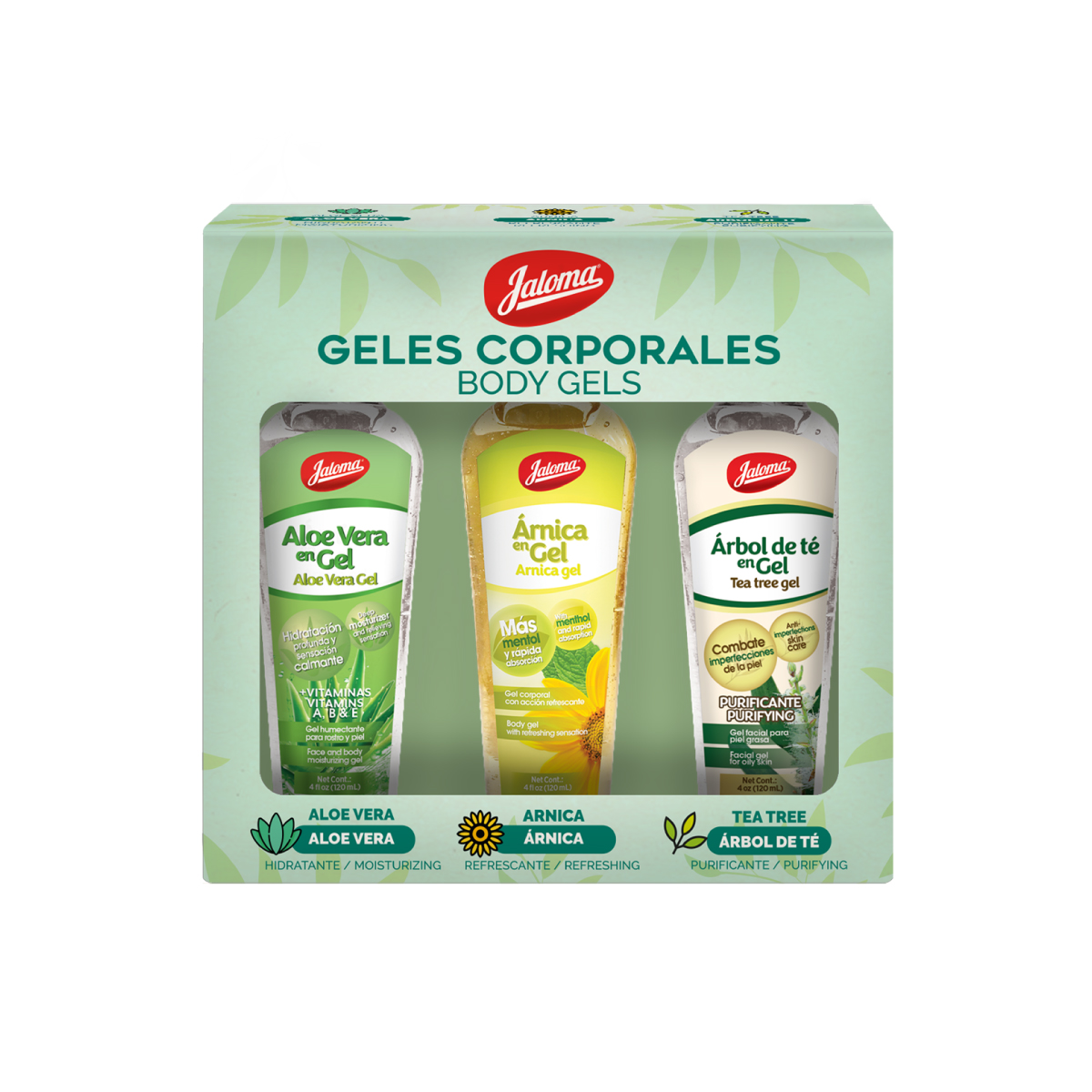 Este Set de Geles Corporales Jaloma cuentan con diferentes propiedades que puedes utilizar en la piel para ayudarte a tratar dolencias musculares o articulares, mientras hidrata y calma tu piel. Este set viene con un gel de aloe vera, gel de árnica y gel de té de árbol, ambos son fórmulas no grasas; como resultado, obtendrás una rápida absorción y sentirás sus beneficios casi inmediatamente.