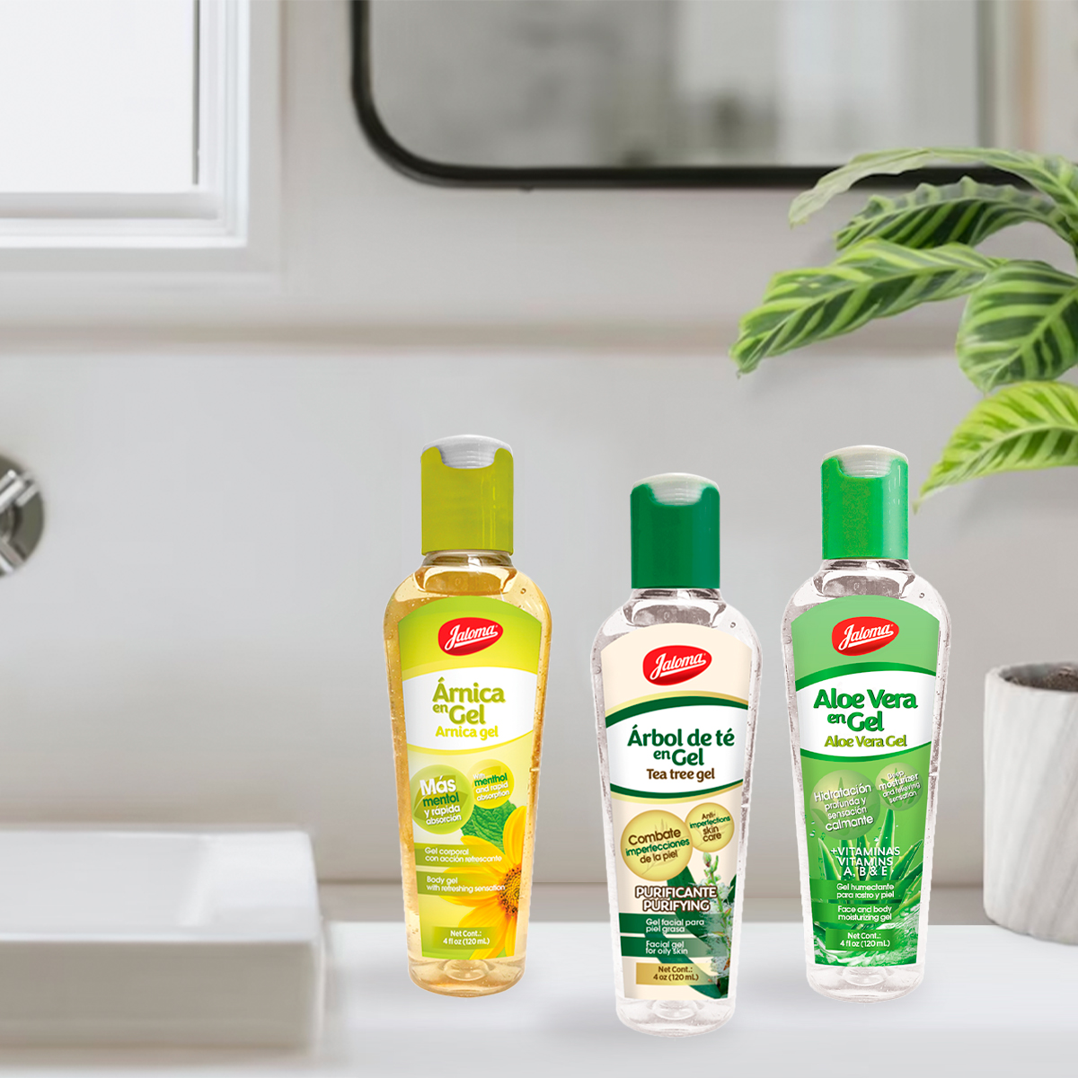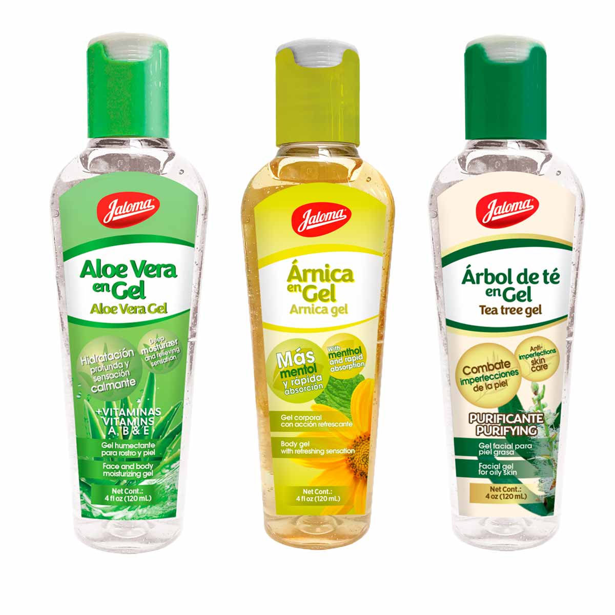 El gel de aloe vera es un producto hidratante, ideal para pieles secas, después de fuerte exposición solar, para después del afeitado o depilado. El gel árnica esta adicionado con mentol que produce una acción refrescante mientas te ayuda a aliviar las molestias en las articulaciones. El gel árbol de té es purificante y mejora la apariencia de la piel con ingredientes naturales.