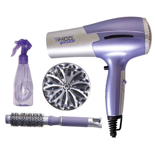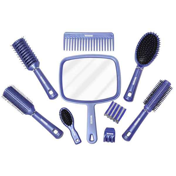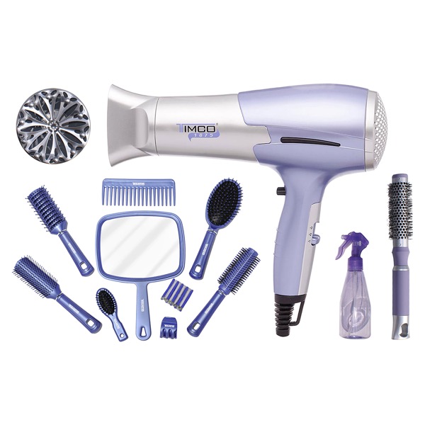 La secadora Timco de este set cuenta con dos velocidades y tres diferentes temperaturas además de una opción de aire frío para que puedas fijar tu peinado. Entre los accesorios encontrarás diferentes tipos de cepillos, un espejo, atomizador, pinza y ligas. ¡Tendrás todo al alcance de tu mano!