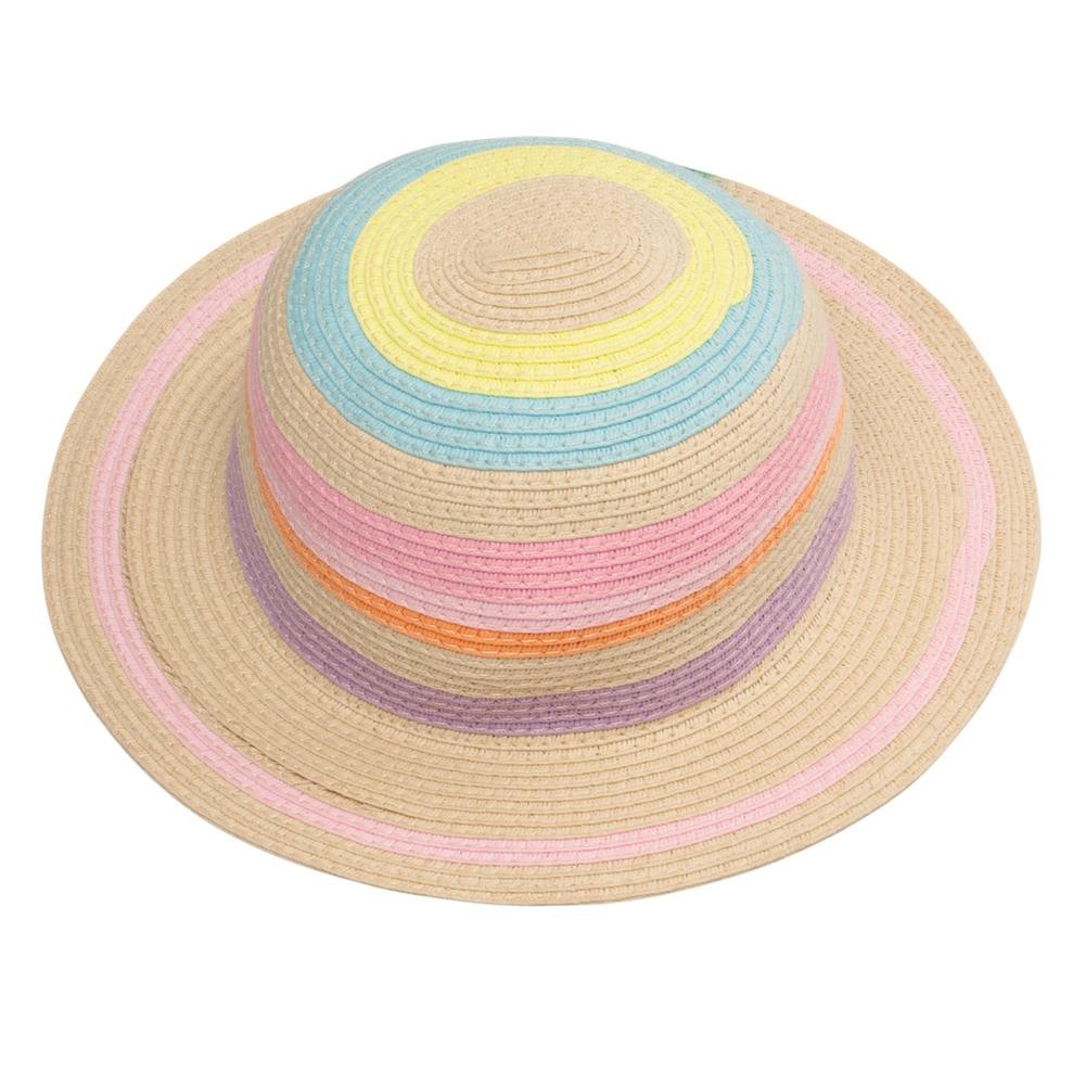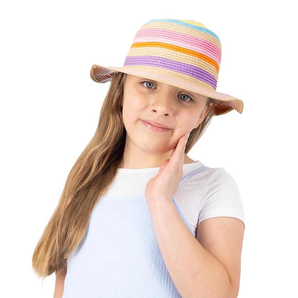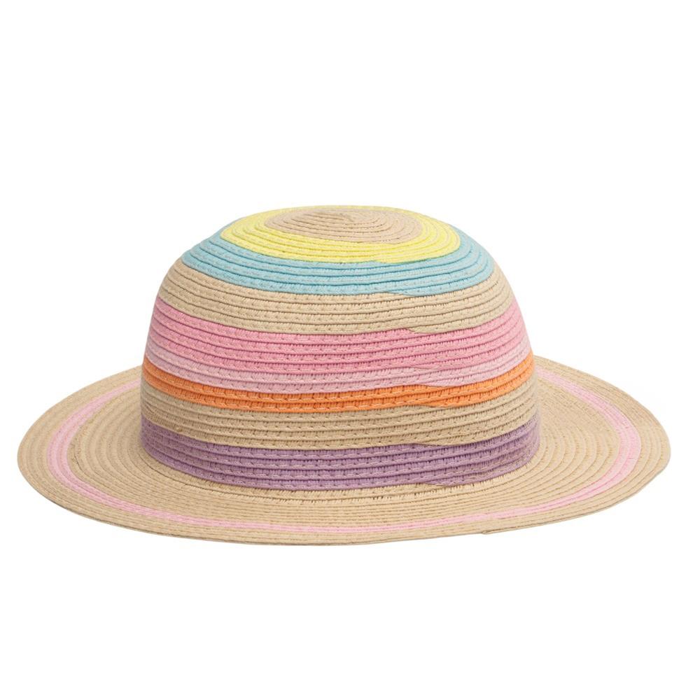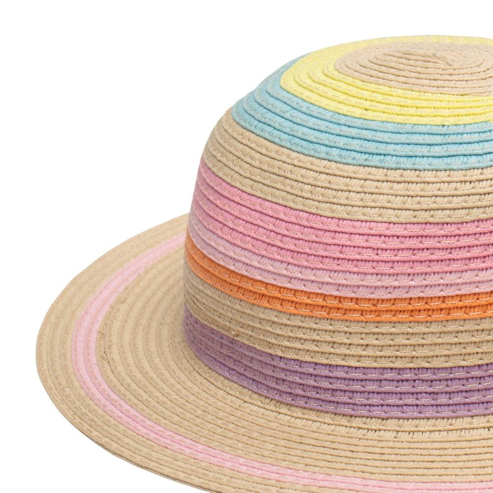Diversión y color bajo el sol. Este sombrero de diseño trenzado captura la atención con sus vibrantes rayas multicolor, ideales para las vacaciones o paseos al aire libre. Su ala ancha protege el rostro de la pequeña, combinando seguridad con un estilo alegre y lleno de vida.