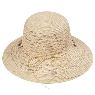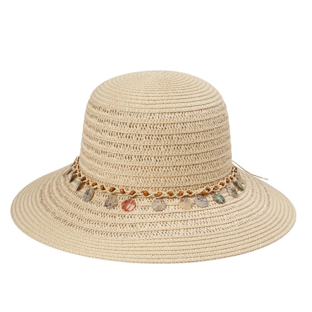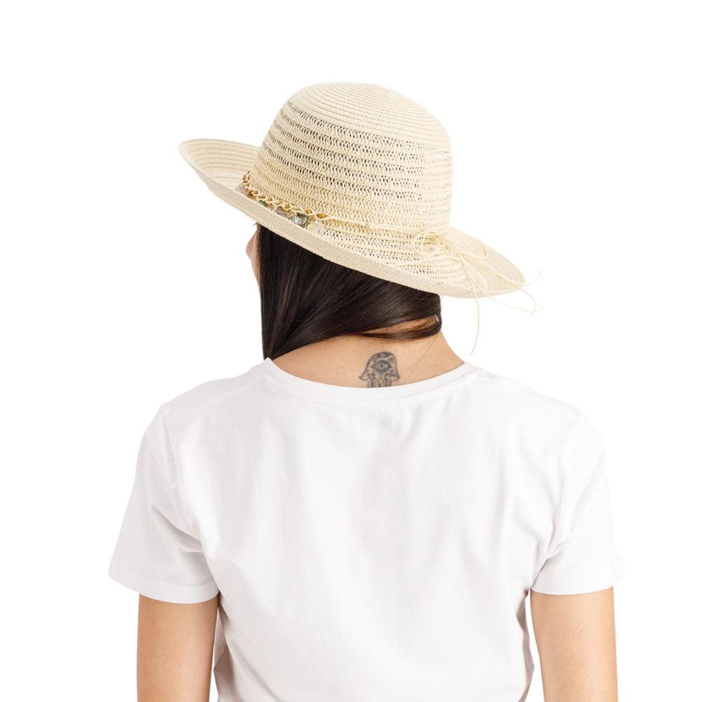 Elegancia veraniega con un toque artesanal. Este sombrero presenta un diseño tipo trenzado con una copa redondeada y ala media. Se distingue por sus sofisticadas aplicaciones de piedra y un lazo decorativo, convirtiéndolo en el accesorio perfecto para un día de playa o un evento de jardín.