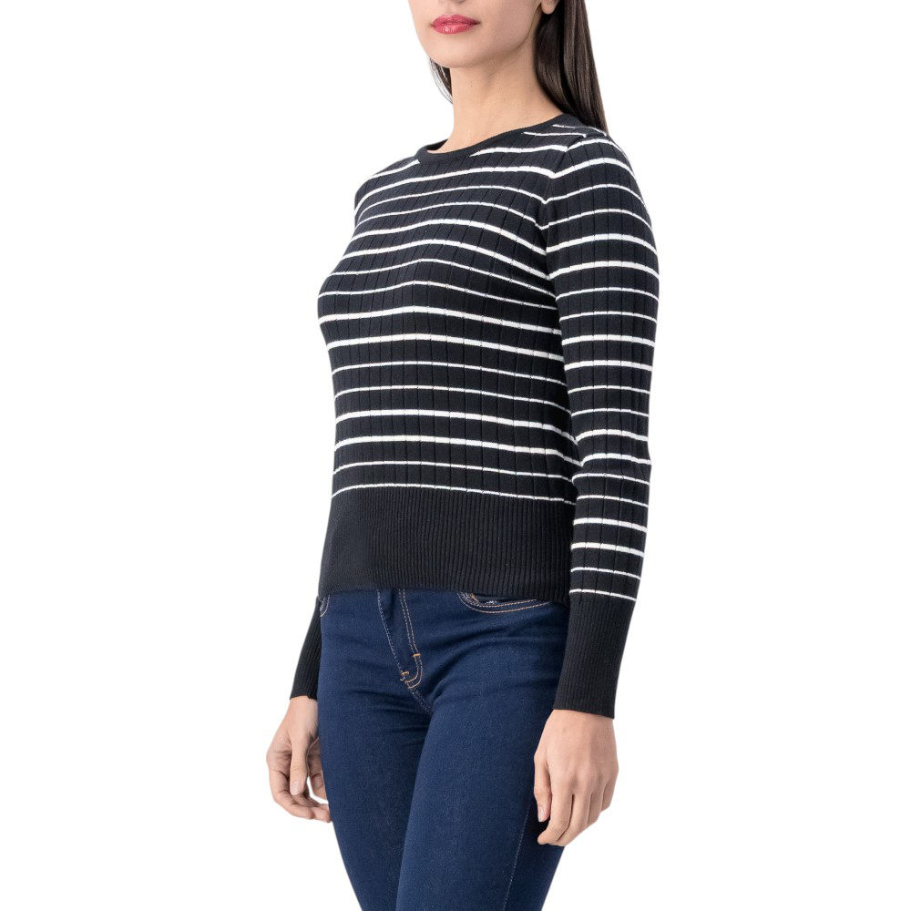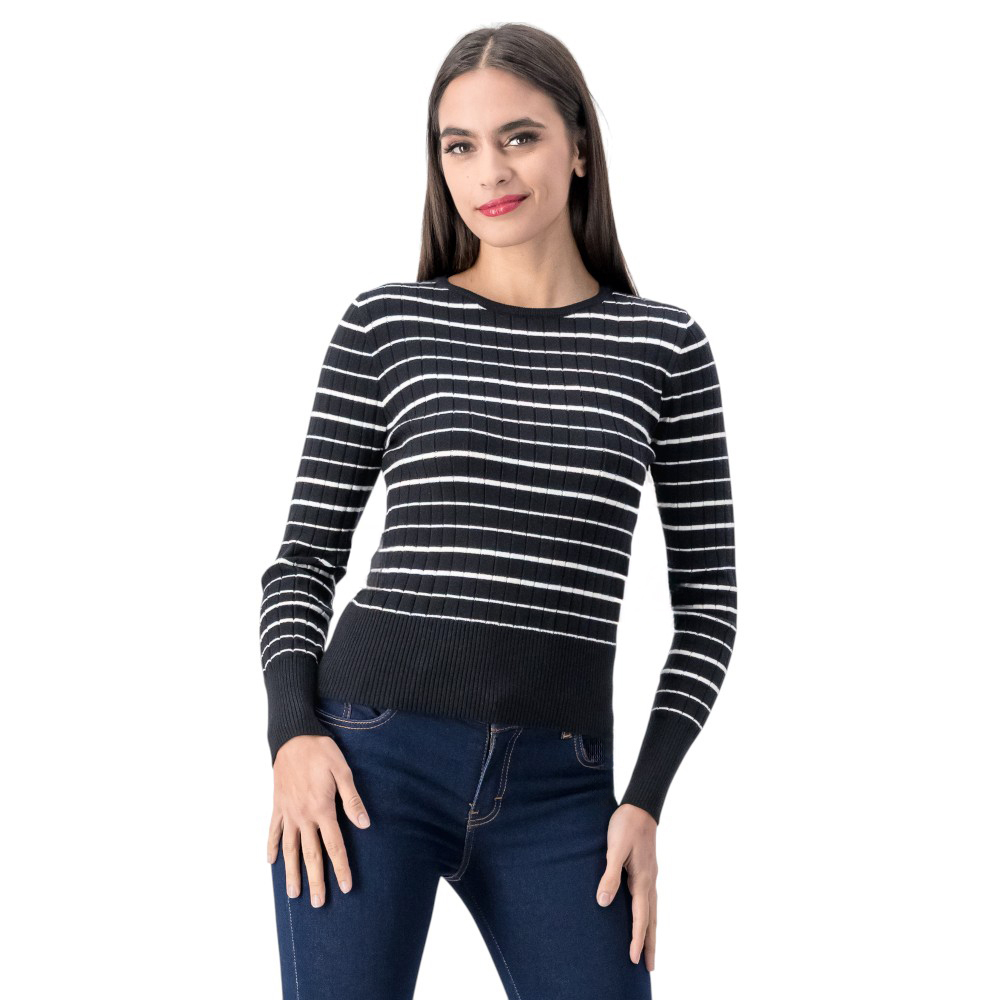 Su confortable cuello redondo y el suave tejido te brindarán comodidad durante todo el día, mientras que el ajuste en puños y ruedo asegura una silueta favorecedora. El atemporal diseño a rayas horizontales lo convierte en una pieza versátil y fácil de combinar, ideal para quienes buscan suéteres de moda que ofrezcan estilo y un toque náutico a sus looks
