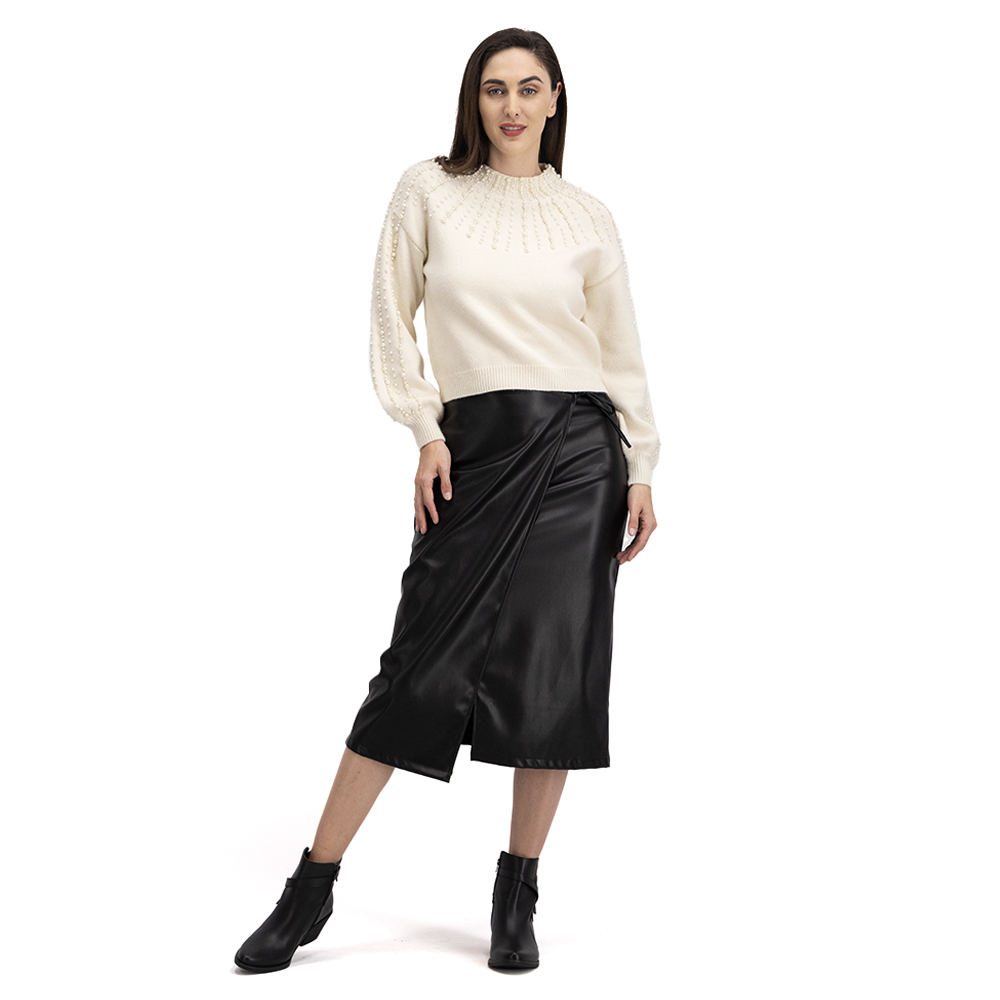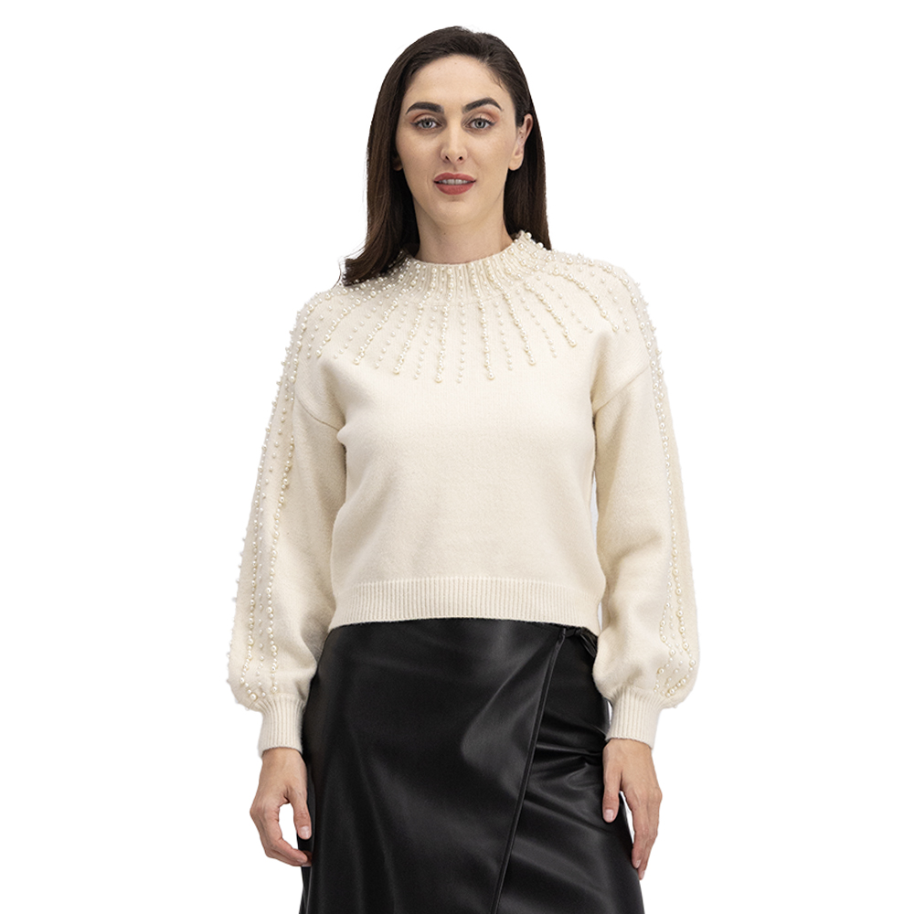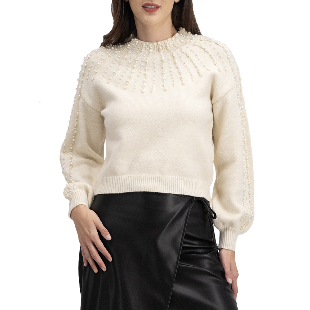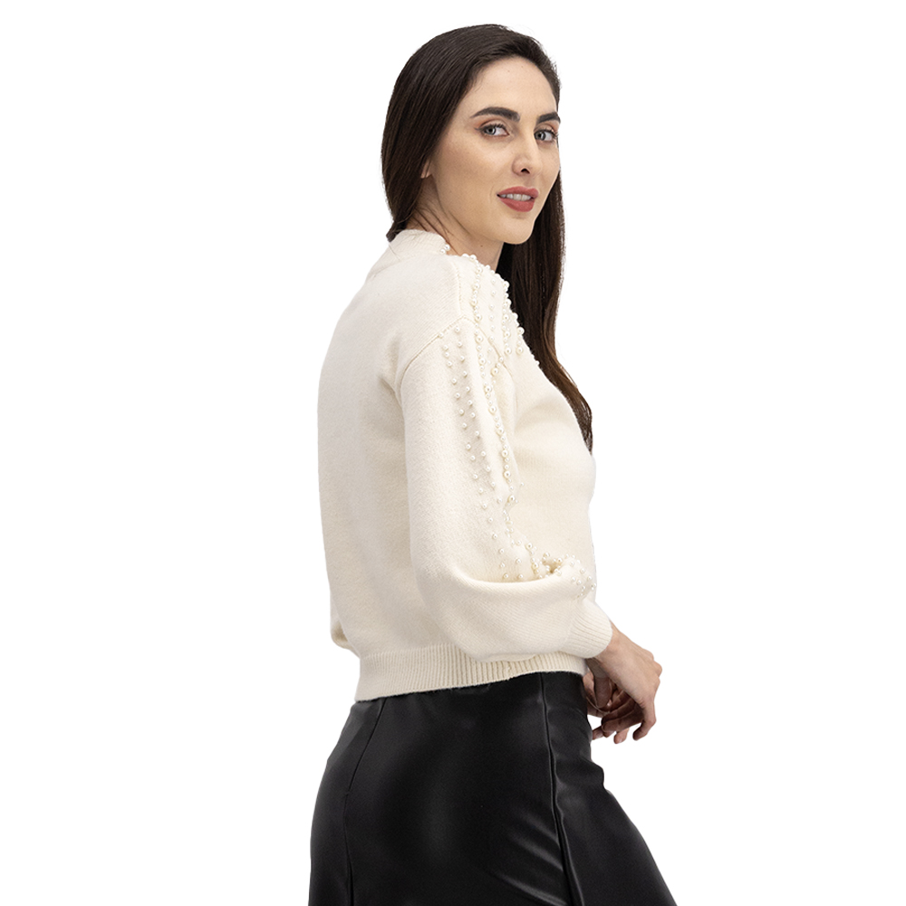 Suavidad y elegancia en un solo diseño. Este suéter tejido cuenta con cuello redondo y aplicaciones de perlas en pecho y mangas, aportando brillo sutil y estilo sofisticado para cualquier ocasión.