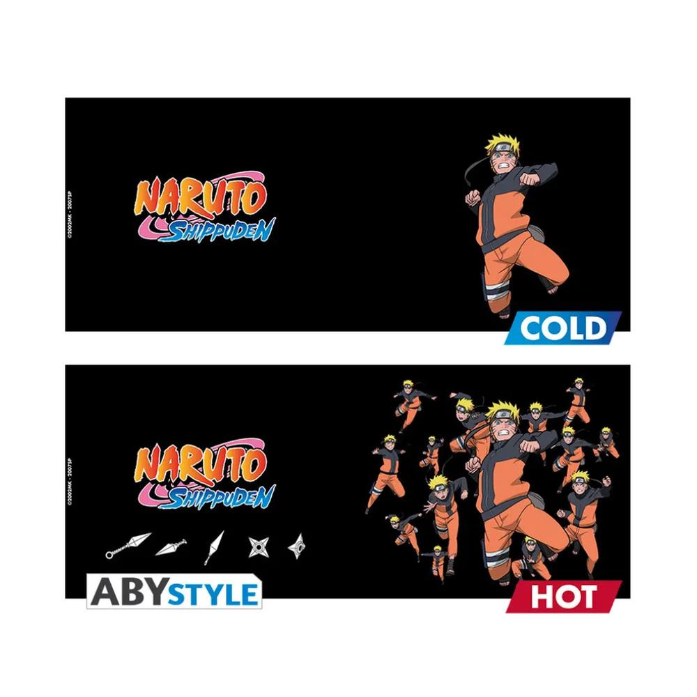 Descubre la taza con cambio de calor de Naruto Shippuden. Con este mágico modelo de Abystyle, Naruto Uzumaki utiliza su técnica favorita para hacer aparecer a sus clones y armas ninja. Al verter una bebida caliente el diseño cambia, mientras revela toda la acción del universo Naruto. Es una imprescindible adquisición para los fans del anime.