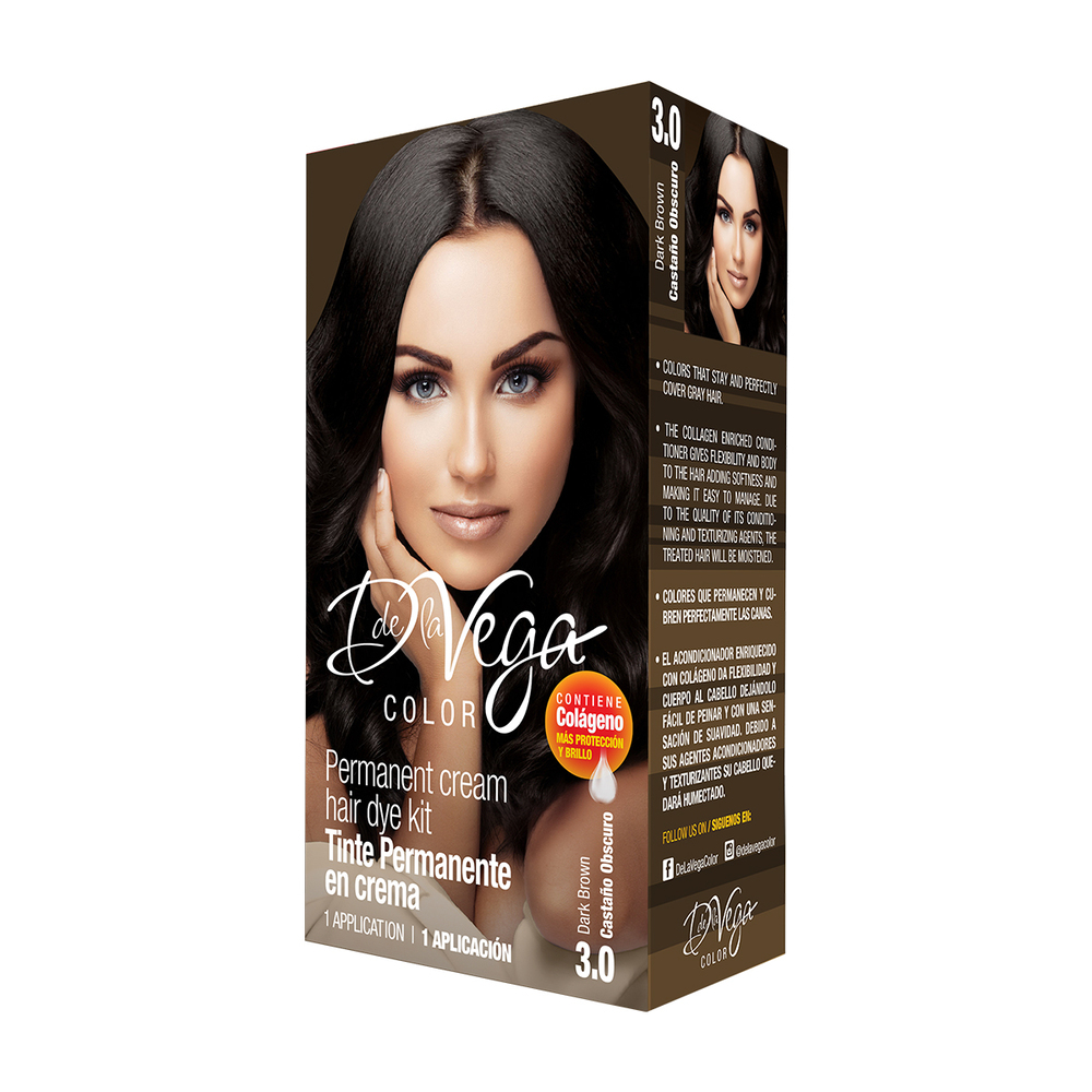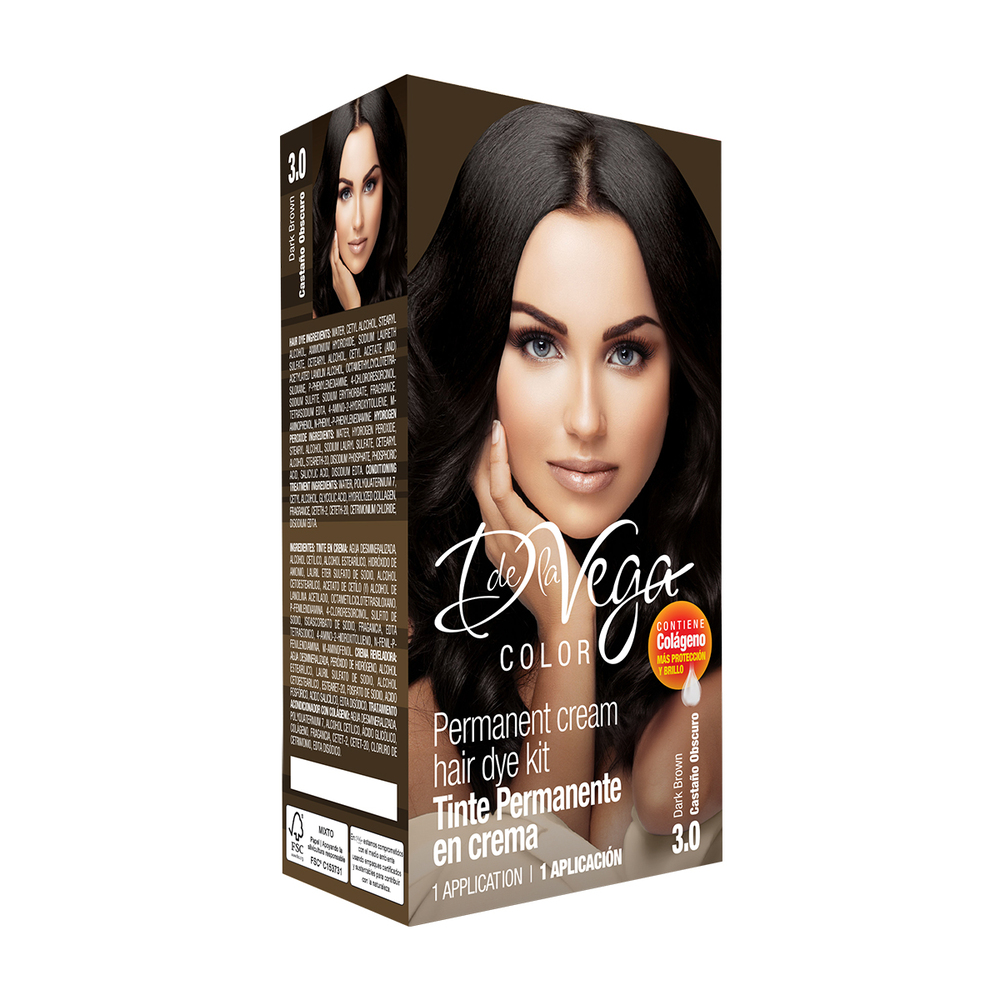 Actualización descripción: El Tinte Permanente en Crema D de La Vega 3.0 Castaño Oscuro ofrece una coloración uniforme y de larga duración gracias a su formulación 1+1, que combina 60 g de tinte con 60 ml de peróxido en crema de 20 o 30 volúmenes. Enriquecido con colágeno, protege y nutre la fibra capilar, ayudando a reducir las puntas abiertas y aportando hidratación, brillo y suavidad para un cabello fácil de manejar y con un acabado profesional.