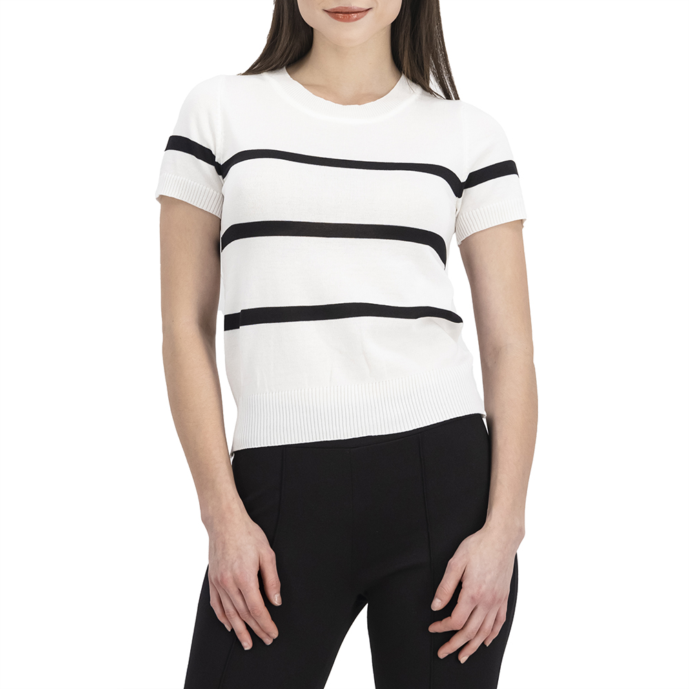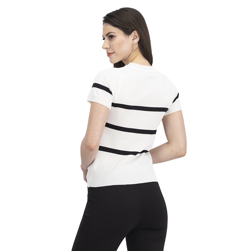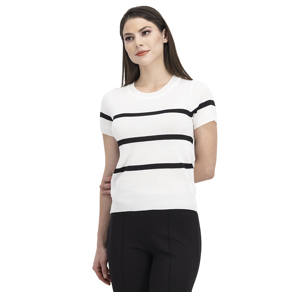 Nuestro top de rayas horizontales es el básico que toda mujer necesita. Con su cuello redondo, manga corta y diseño clásico de rayas, es perfecto para cualquier ocasión. Confeccionado en un tejido suave y ligero, te brinda la máxima comodidad durante todo el día