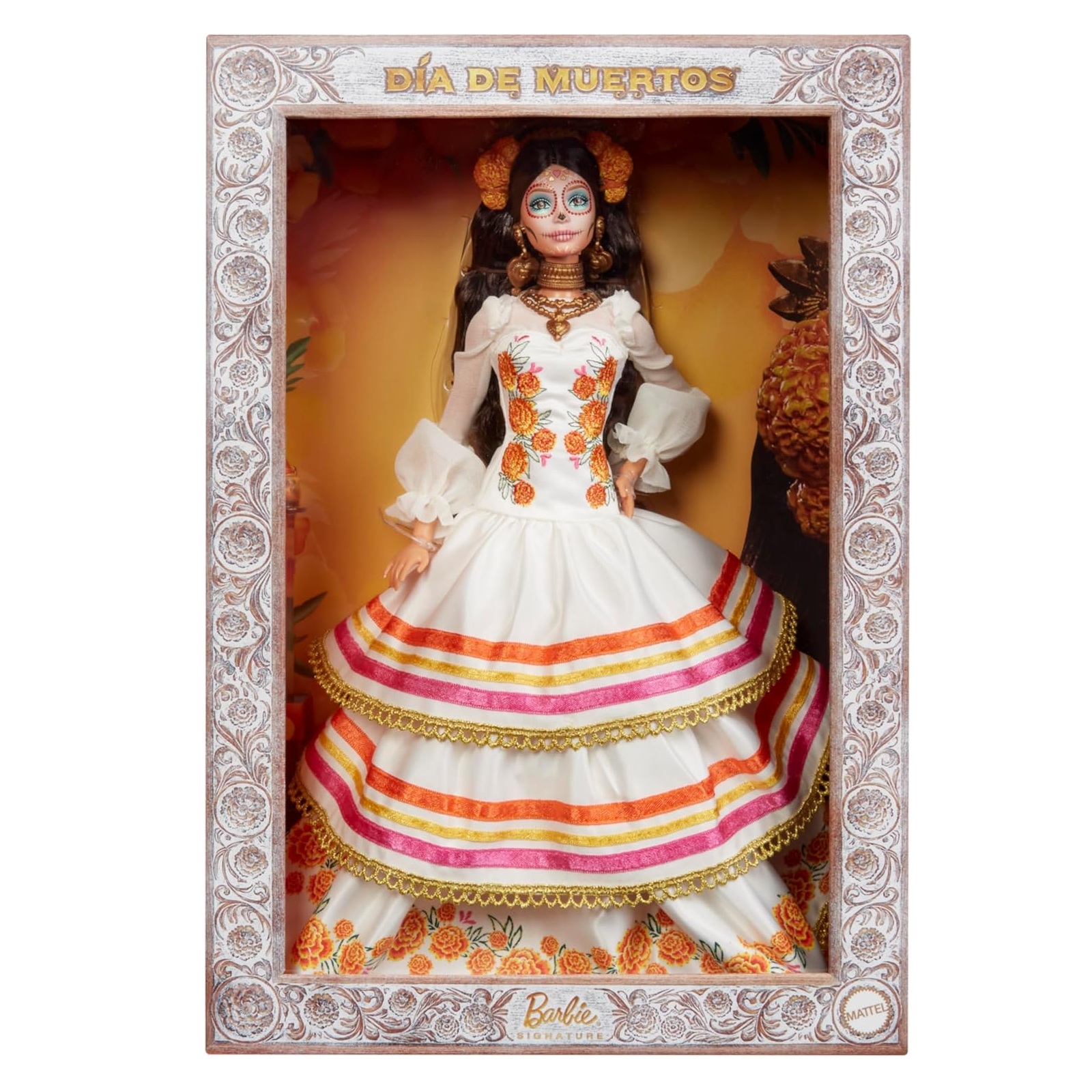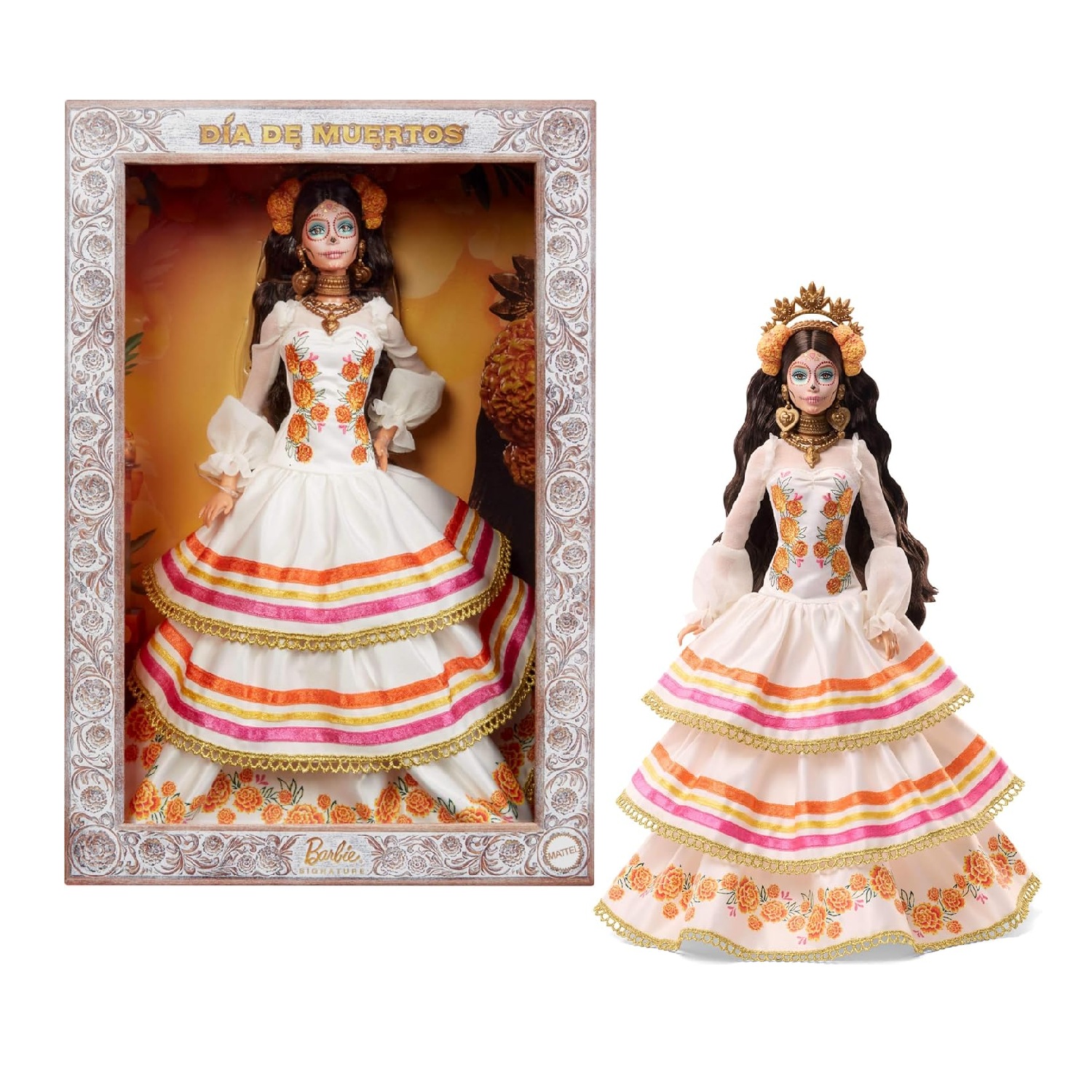 La Barbie Día de Muertos 2025 celebra la vida y la tradición mexicana con un diseño lleno de simbolismo y elegancia. Su vestido color crema, inspirado en la flor de cempasúchil, combina volantes, encaje dorado y cintas brillantes, mientras que detalles como flores delicadas, corona de cempasúchil y maquillaje de calavera evocan la riqueza cultural del Día de Muertos. Los accesorios y la mayor articulación permiten exhibirla en diversas poses, convirtiéndola en un regalo o pieza de colección excepcional.