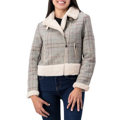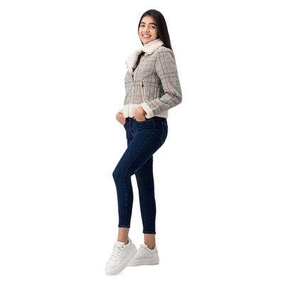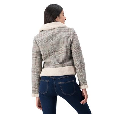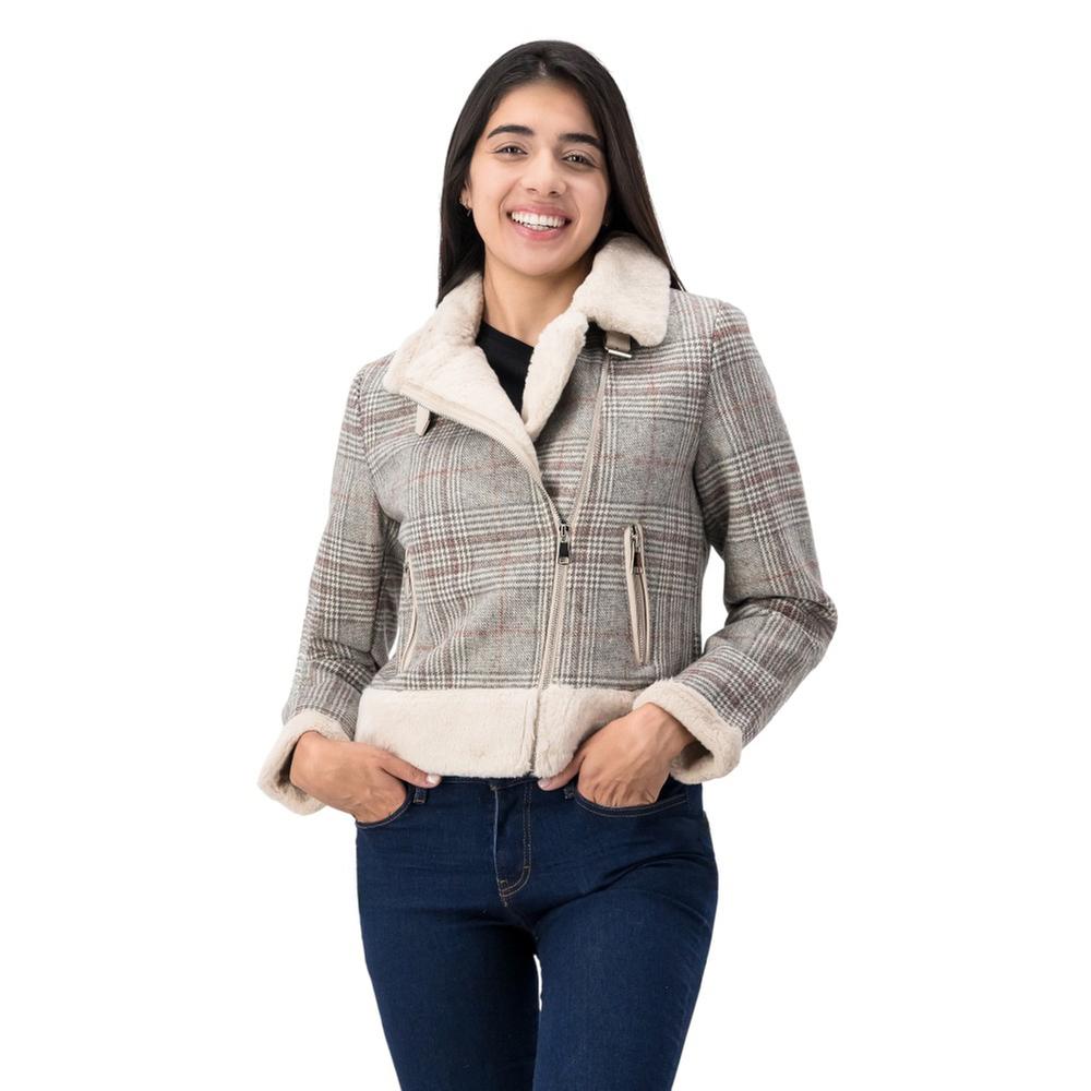 Rebeldía con estilo campestre. Esta chamarra tipo biker destaca por su diseño de cuadros audaz. Incluye bolsas laterales con cremallera y detalles con peluche que añaden confort y un toque distintivo.
