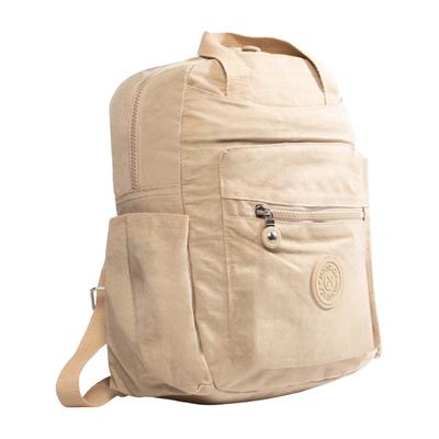 Mochila beige con múltiples compartimentos y zipper, perfecta para organizar todo lo necesario con un diseño liso que incorpora detalles al tono para un estilo moderno y atractivo.